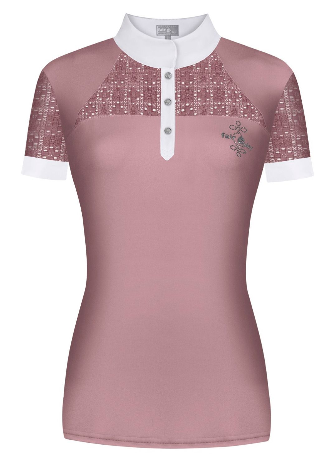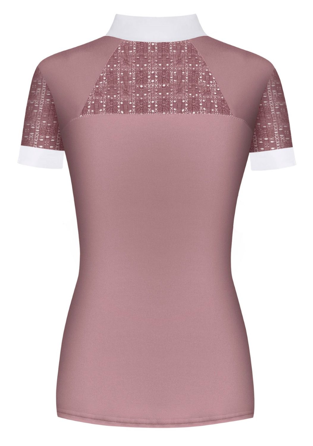 Elegant and feminine competition shirt with short sleeves. The shirt is made of an elastic and breathable technical fabric, which is fully recycled. It offers UV protection. The elastic lace pieces on the front, back and sleeves ensure optimum ventilation. Finished with luxury buttons and an embroidered logo.