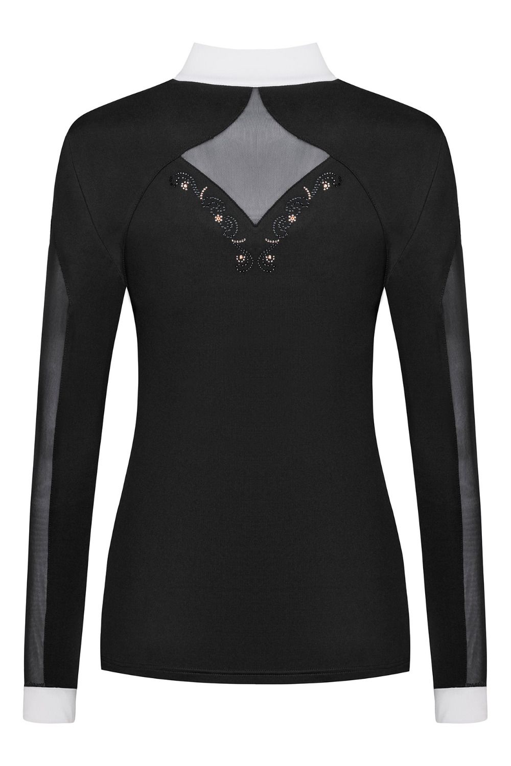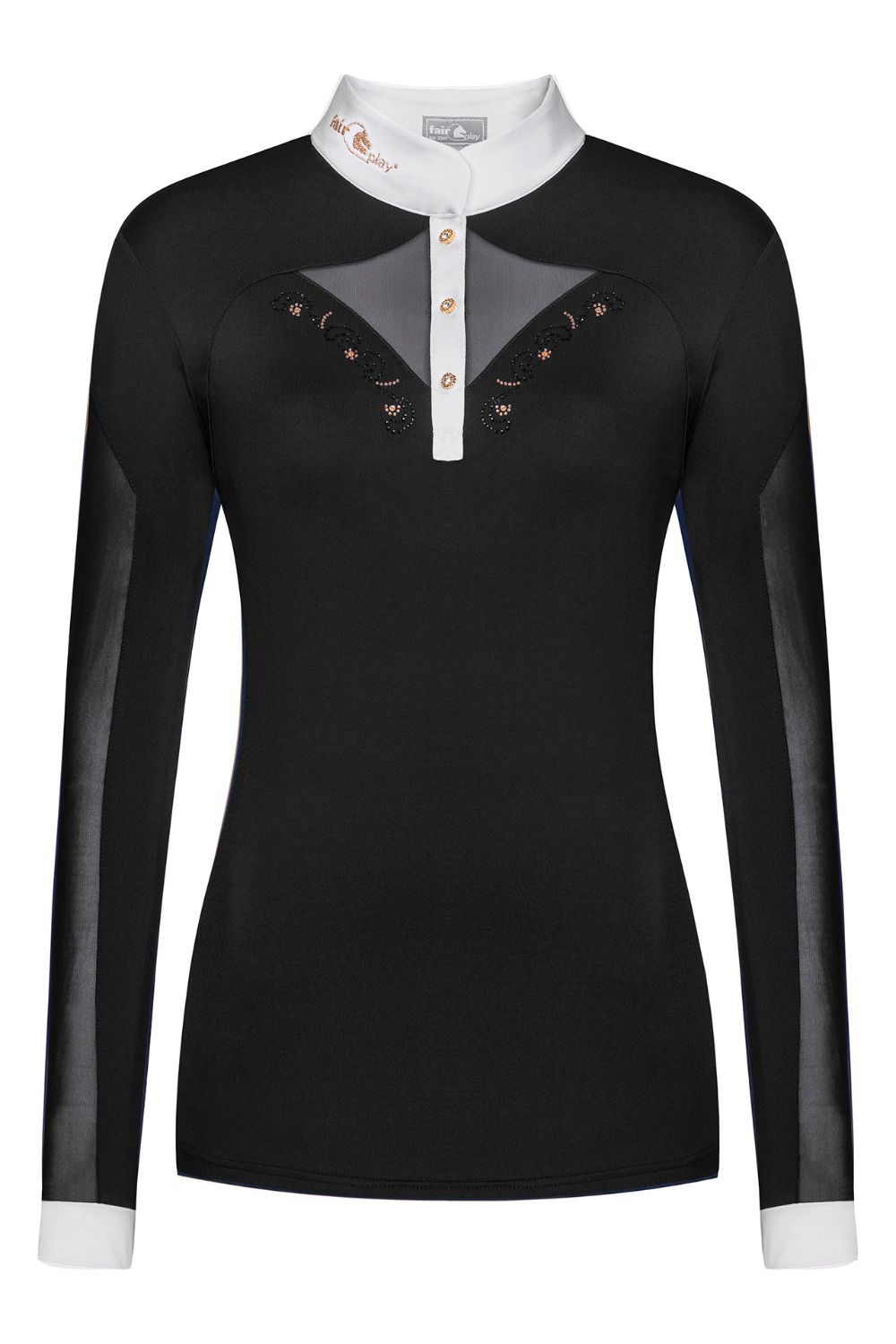Elegant competition shirt by Fair Play with rose gold crystal details. The shirt is made of elastic and breathable fabric and has a fitted fit. In addition, the shirt protects against UV.