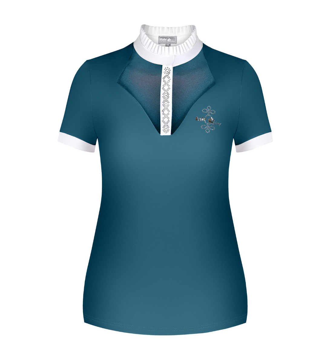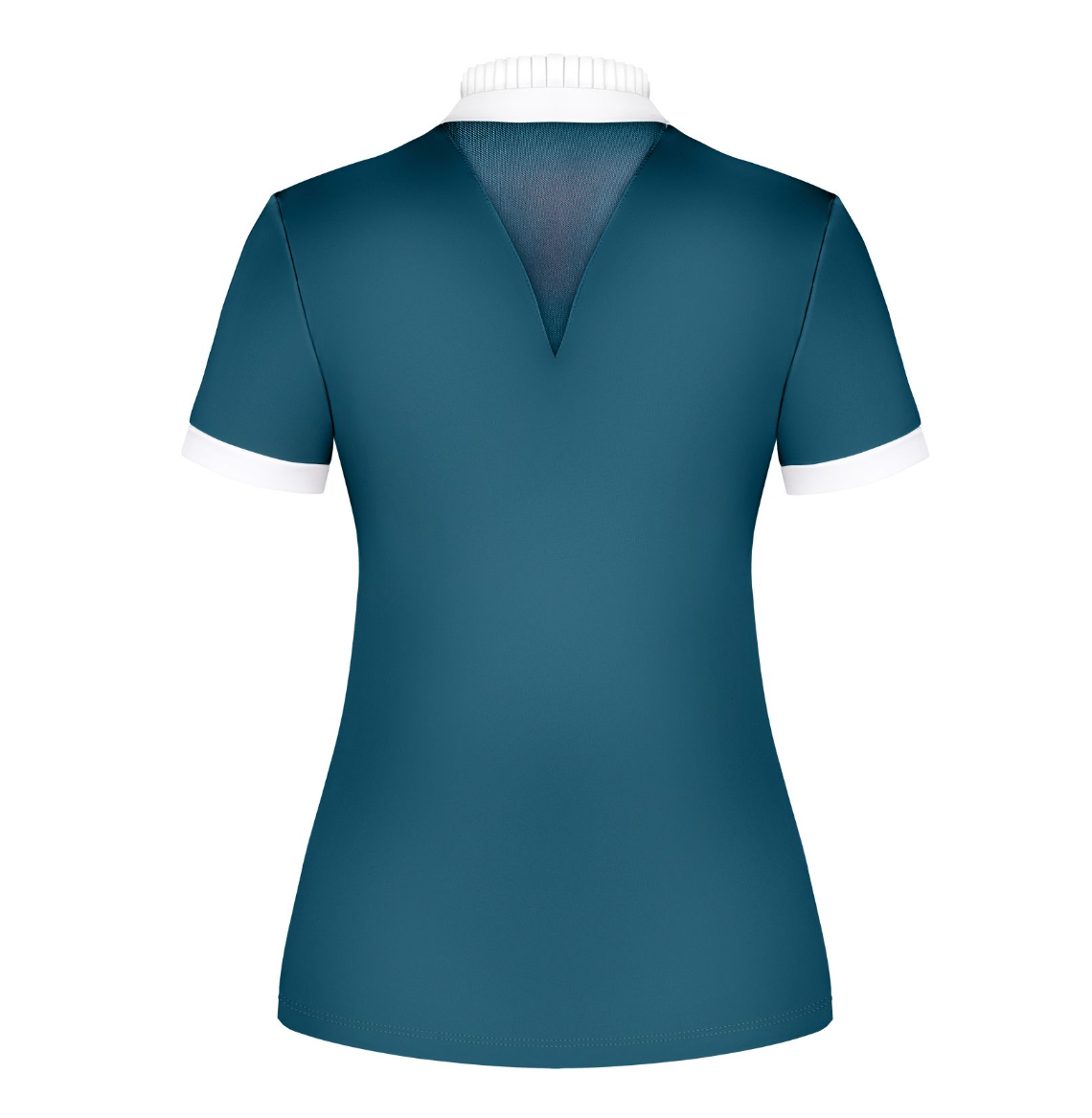 Dit elegante en vrouwelijke wedstrijdshirt is gemaakt van elastisch, ademend materiaal met UV-bescherming. De geplooide opstaande kraag zorgt voor een chique uitstraling, terwijl de elastische mesh-inzetstukken aan de voor- en achterkant extra ventilatie bieden. De voorsluiting is subtiel versierd met discreet glinsterende kristallen en sluit met verborgen drukknoopjes. Het decoratieve Fair Play-logo maakt het stijlvolle ontwerp compleet.