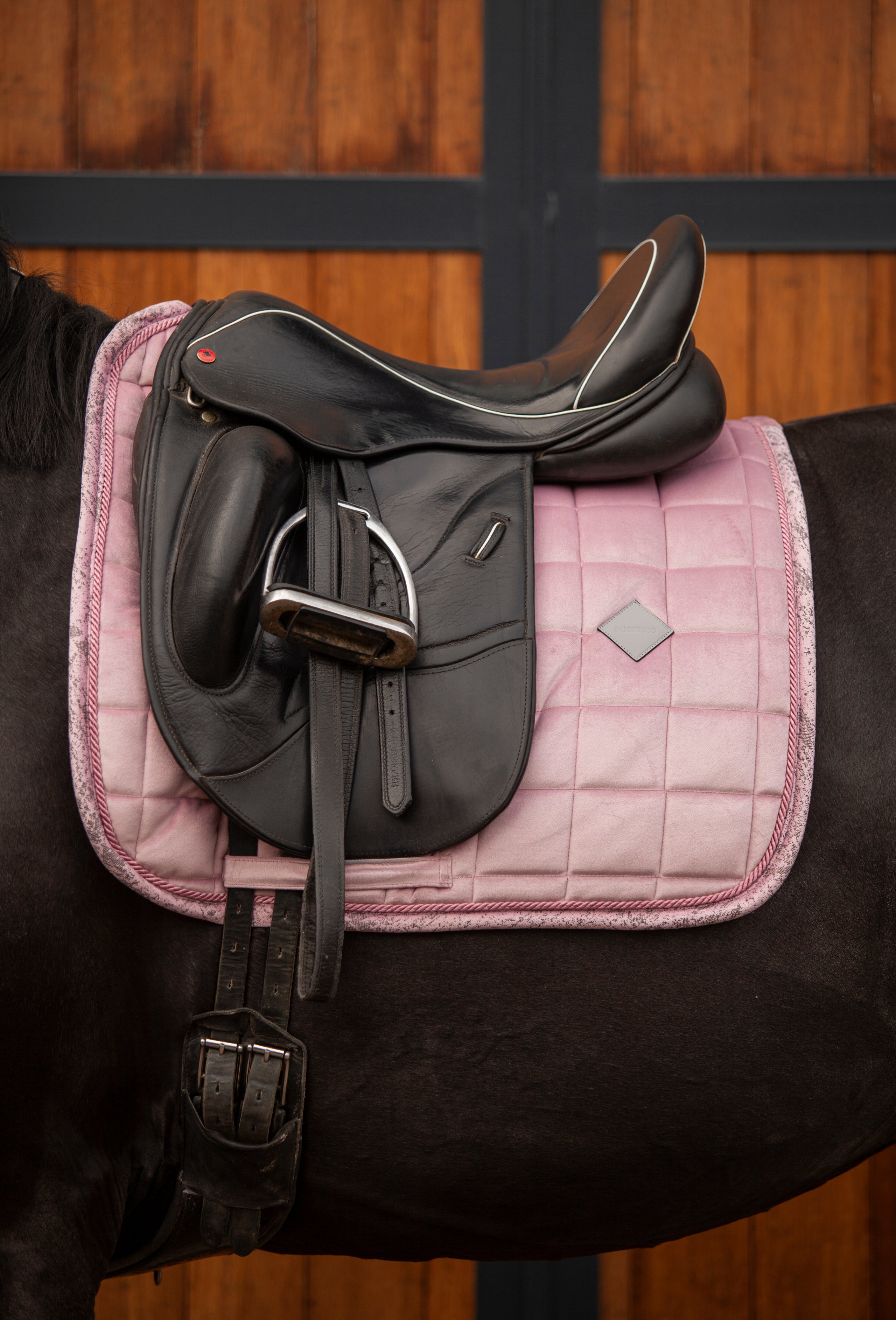 This lightweight saddle pad has a beautiful cut-out at the withers for ultimate freedom of movement. The saddle pad contains cords that can be attached to the girth straps, and has a cord through which the girth and/or girth straps can be attached.