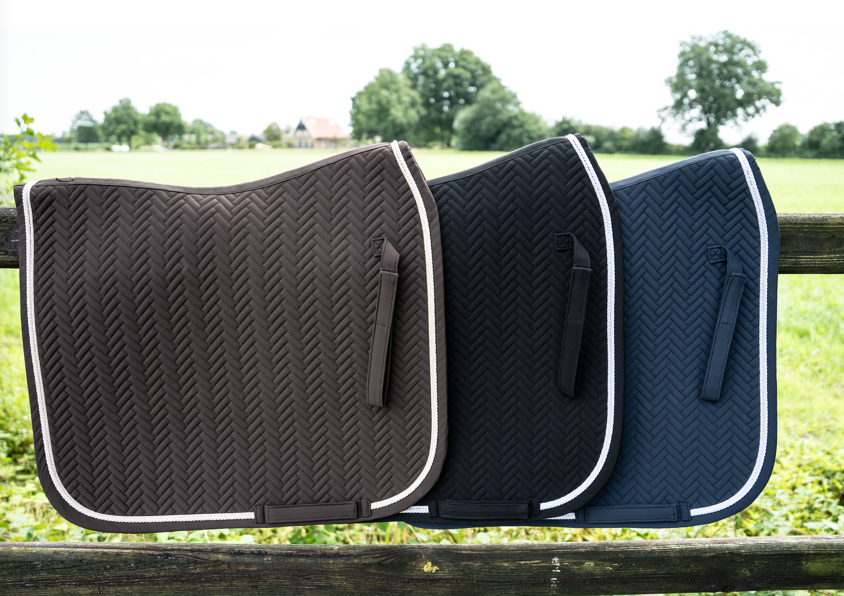 Het Florence zadeldek biedt comfort, stabiliteit en een stijlvolle afwerking tijdens elke rit. De schuim- en wattenvulling zorgt voor een zachte drukverdeling en effectieve schokdemping, zodat je paard optimaal comfort ervaart. Dankzij de lussen met klittenbandsluiting blijft het dek stevig op zijn plek, zelfs tijdens intensieve trainingen.