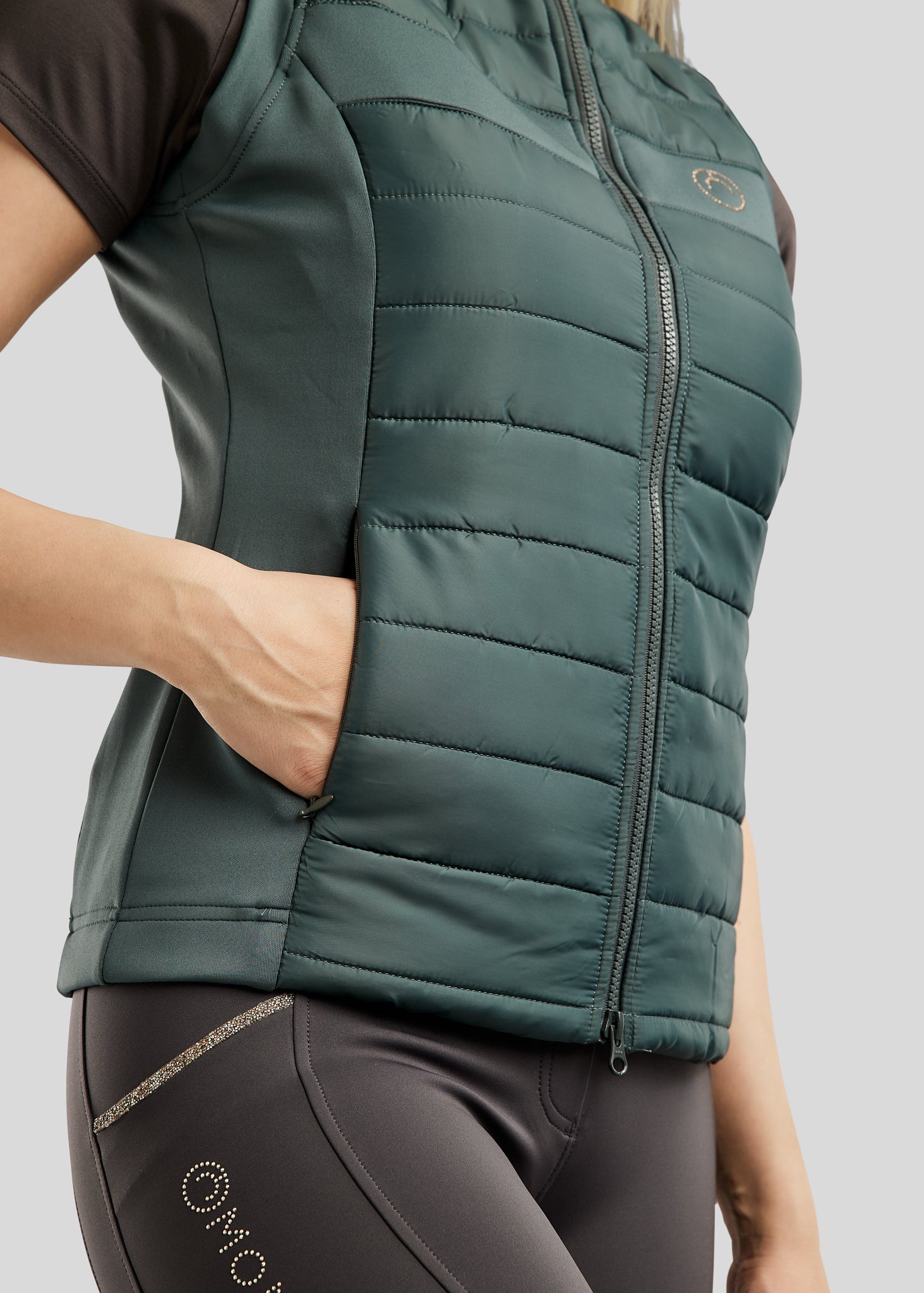 De bodywarmer is afgewerkt met een prachtige champagnekleurige kristallen band rond de halslijn, wat een luxe en verfijnde touch geeft. Op de borst is een discreet Montar-logo van champagnekleurige kristallen aangebracht op een elegant softshell-paneel, waarmee het exclusieve design compleet is.