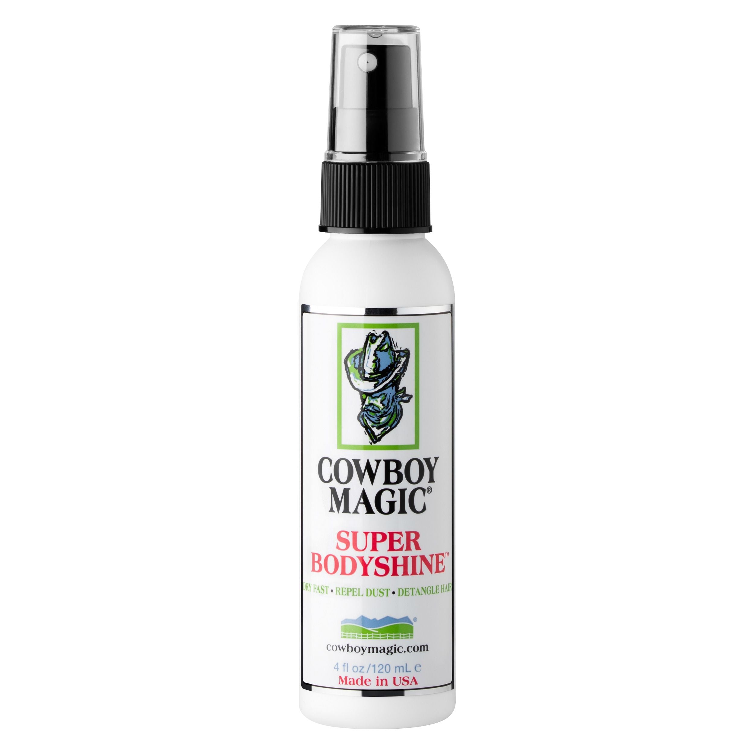 Spray de Cowboy Magic Super Bodyshine op een schone vacht (vermijd hierbij de zadelplek) en strijk de haren vlak met uw hand. Laat de vacht even drogen en ga vervolgens met een zachte doek of zachte borstel over de vacht van uw paard.