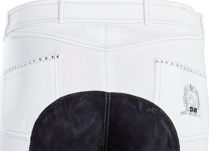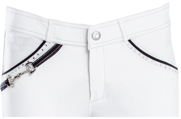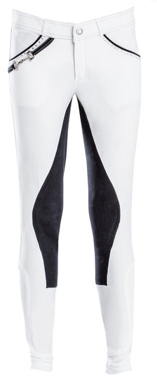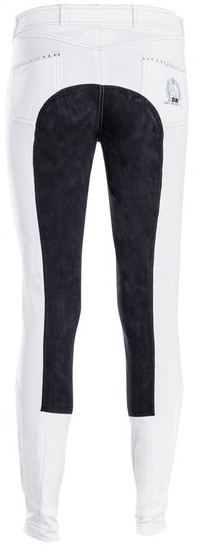 Chique witte wedstrijdbroek met zwart clarino zitvlak en subtiele details.