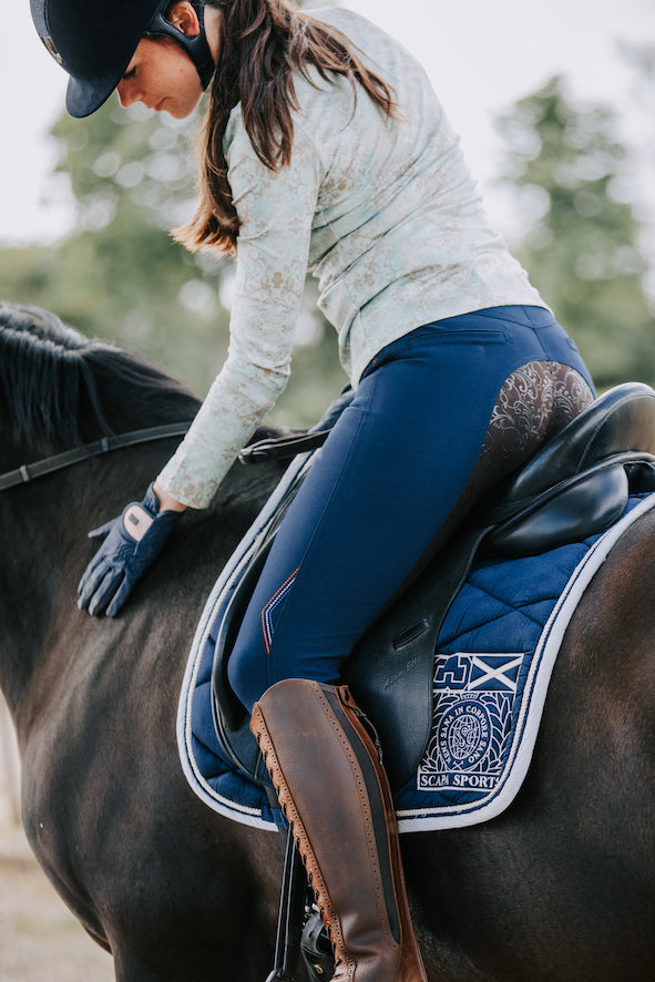 Prachtige rijbroek met bruin siliconen bloemmotief. Een perfecte rijbroek voor diegene die niet van zoveel bling en poespas houdt.