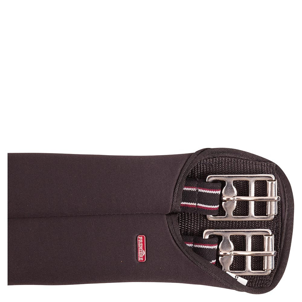 Neopreen dressuursingel verstevigd met polypropyleen. De singel heeft aan één zijde elastische uiteinden, de andere uiteinden zijn van polypropyleen.