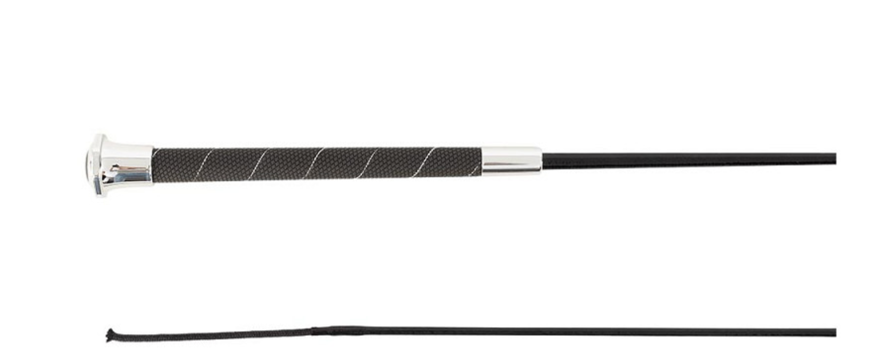 Deze elegante zweep heeft een kern van fiberglas met een verstevigende, glanzende coating. De speciale coating zorgt voor een mooie glans en langere levensduur. Ook het geïmpregneerde klapkoordje (10 cm) blijft lang mooi. Het handvat is overtrokken met anti-slip materiaal voor een perfecte grip en is afgewerkt met en dun, glanzend spiraaldraadje.