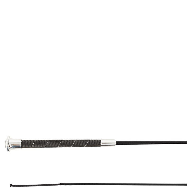 Deze elegante zweep heeft een kern van fiberglas met een verstevigende, glanzende coating. De speciale coating zorgt voor een mooie glans en langere levensduur. Ook het geïmpregneerde klapkoordje (10 cm) blijft lang mooi. Het handvat is overtrokken met anti-slip materiaal voor een perfecte grip en is afgewerkt met en dun, glanzend spiraaldraadje.