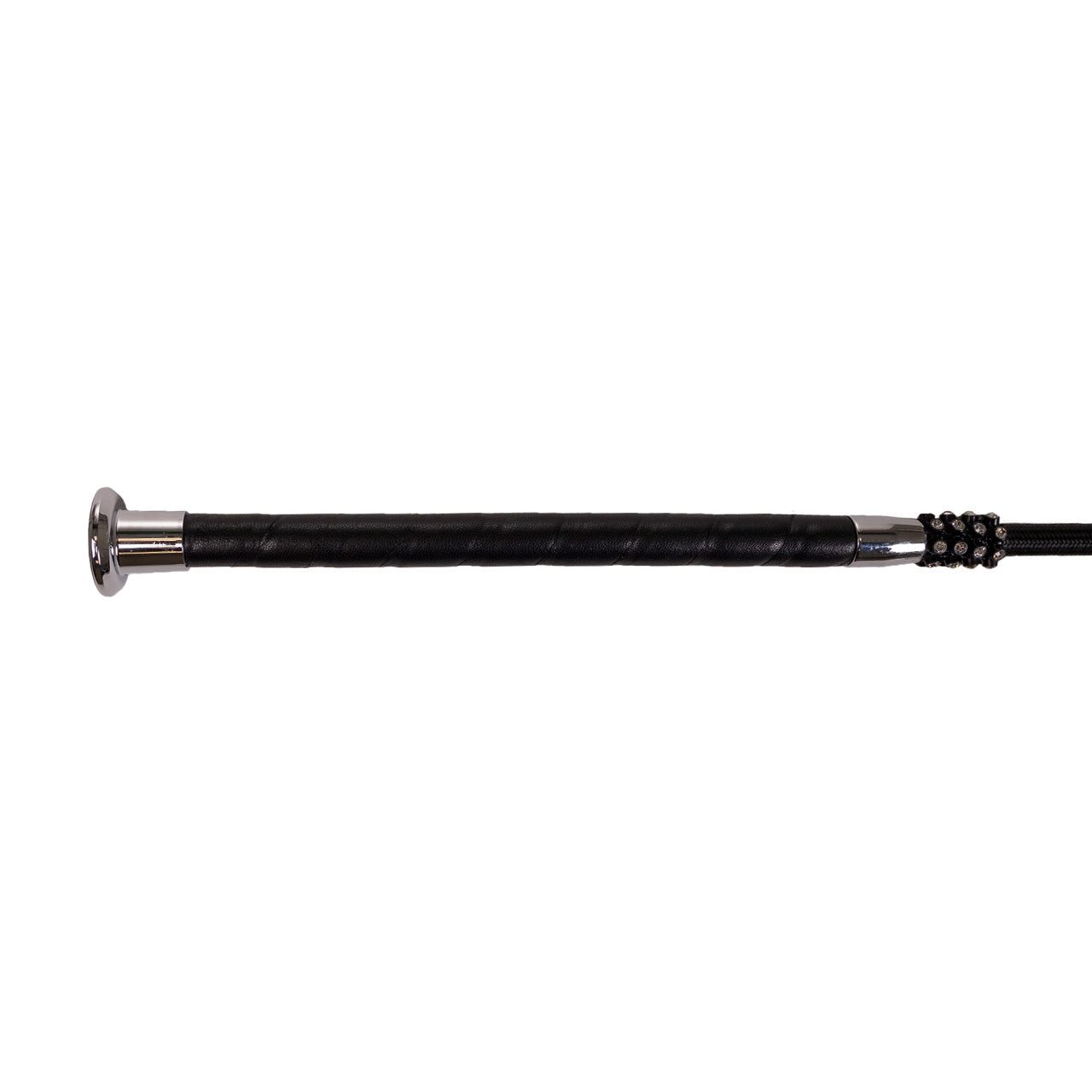 De dressuurzweep Shine heeft een elegante en luxe uitstraling. Deze zweep is afgewerkt met een zilverkleurige knop en strass steentjes onder het handvat.
