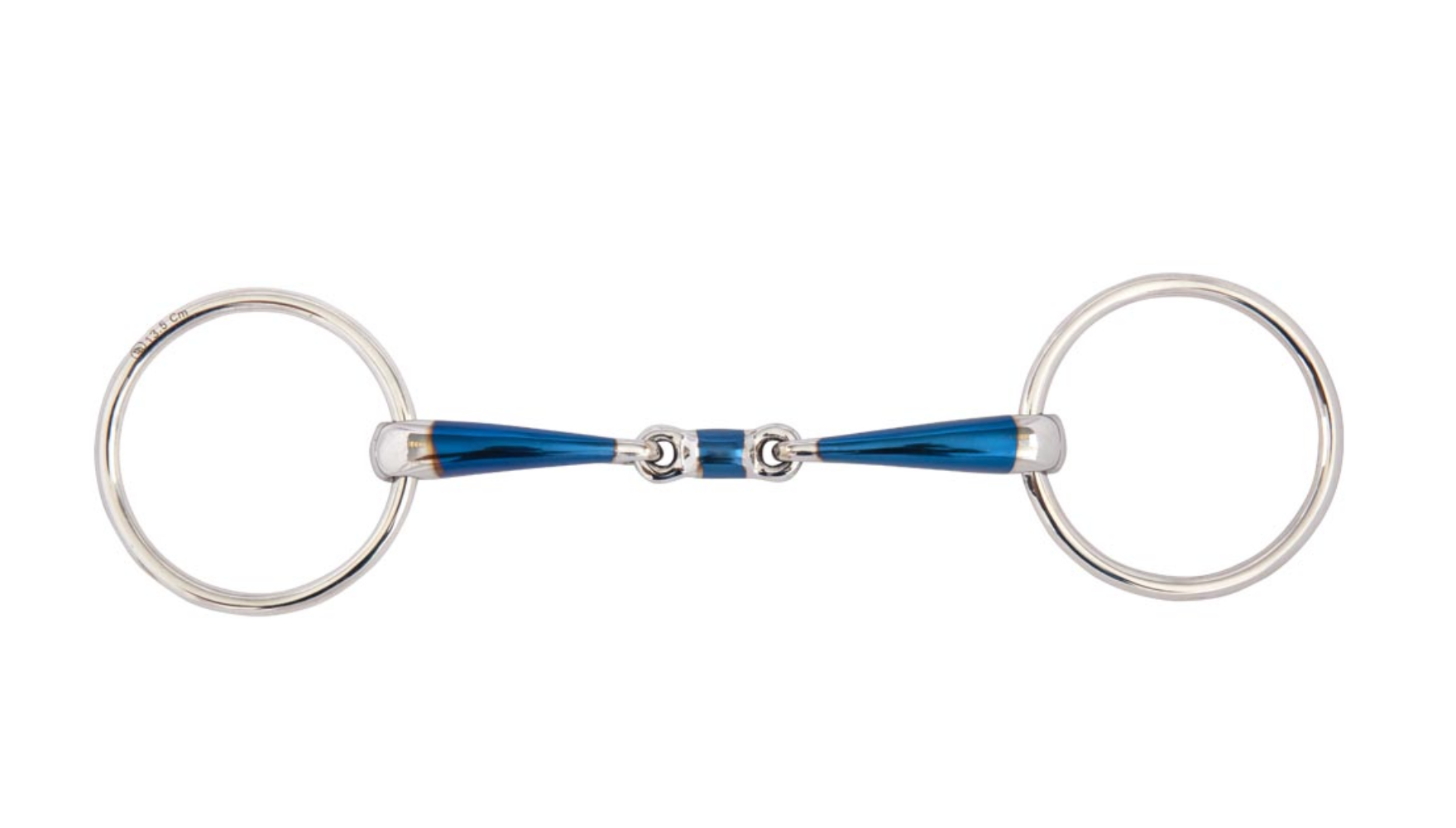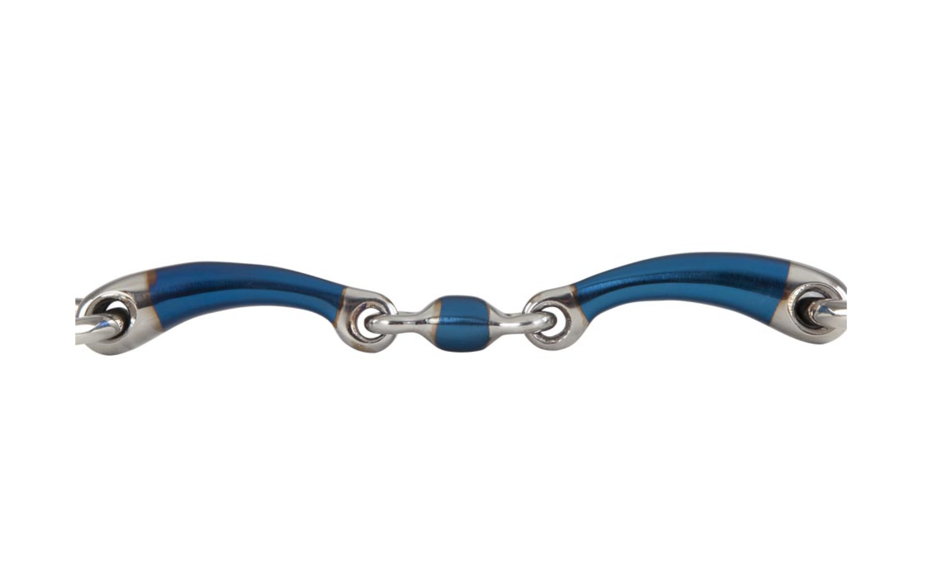 Deze dubbel gebroken watertrens is vervaardigd van massief roestvrij stalen ringen en een zacht stalen mondstuk gecombineerd met een sweet iron laagje op het mondstuk (blauw). De sweet iron coating op het mondstuk stimuleert de aanmaak van speeksel. Wanneer dit materiaal reageert met vocht, warmte en lucht zal het oxideren en een zoet smakende oppervlakteroest ontwikkelen. Dit helpt bij de acceptatie van het bit. Uiteindelijk verdwijnt de blauwe kleur, maar de smaak van het oppervlakteroest blijft.