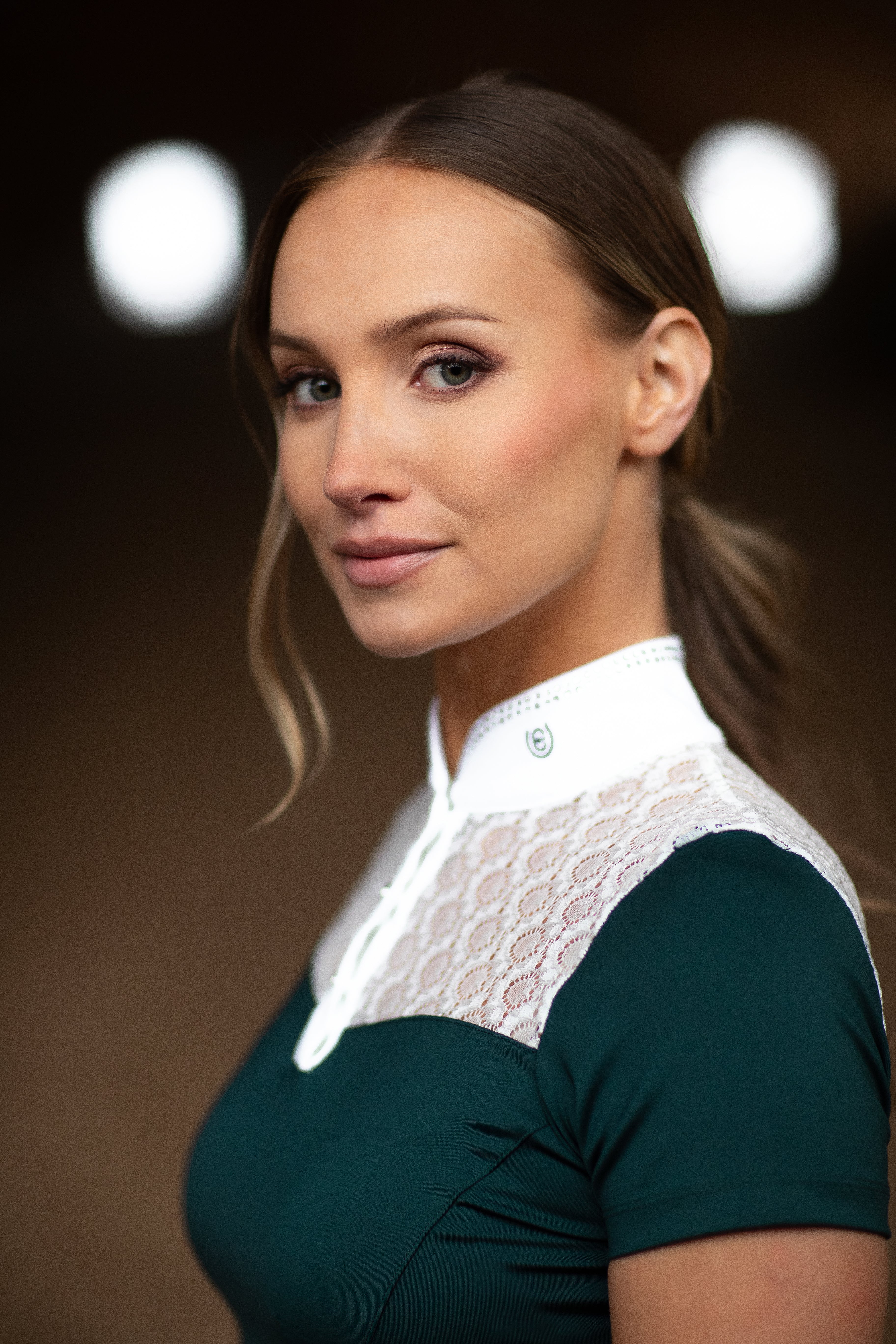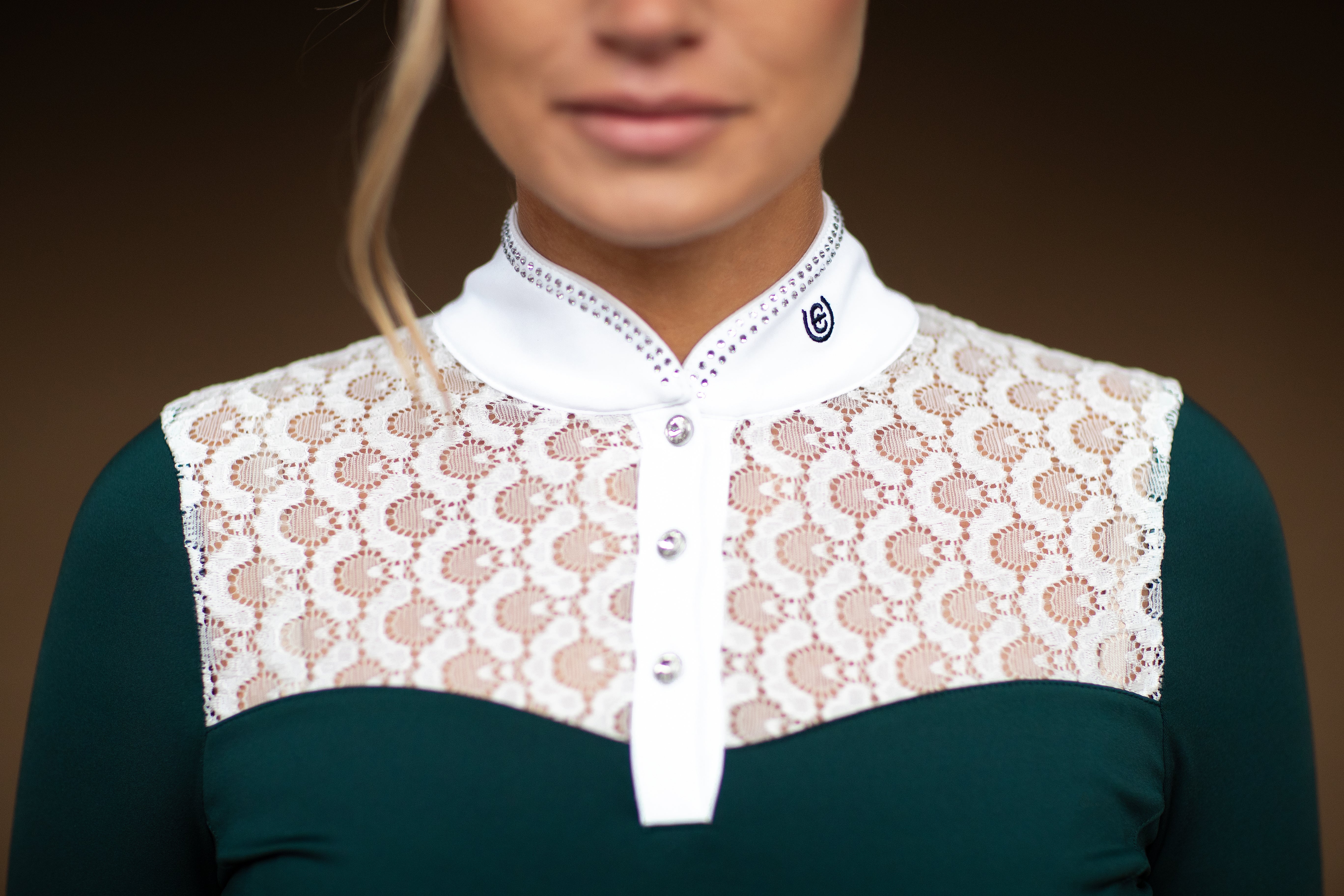 Details: Kleine heldere kristallen, 2 rijen langs de hele kraagrand / Klein Equestrian Stockholm-logo in groen aan de linkerkant van de kraag / Romantisch kanten patroon / Kleine diamanten knopen aan de voorkant