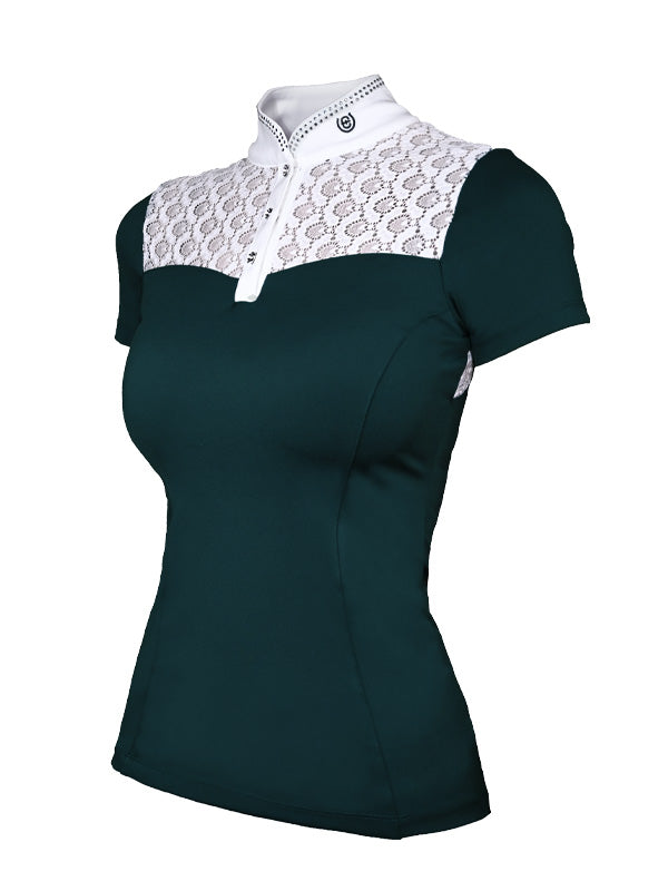 Onze Crystal Champion Top is ontworpen in een prachtige dramatische groene kleur met prachtige witte kanten details aan zowel de voorkant als de achterkant. Versierd met mooie kristallen langs de kraagrand en kristallen knopen aan de voorkant, waardoor je opvalt in de menigte tijdens de wedstrijd. Draag het topje mooi samen met ons wedstrijdjasje uit de Dramatic Monday-collectie voor een complete look.