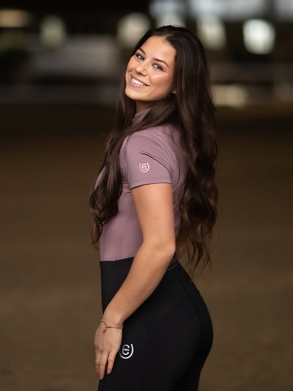 Details: Verticaal Equestrian Stockholm-logo op de rug in roségoud. Klein roségouden Equestrian Stockholm-logo op de linkerarm.