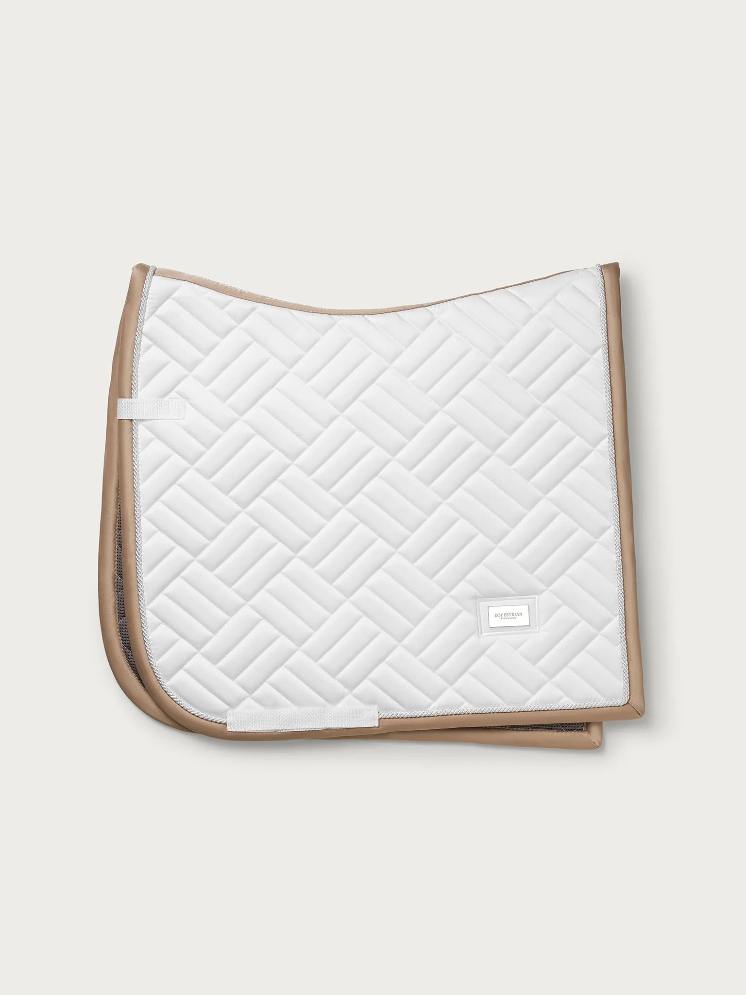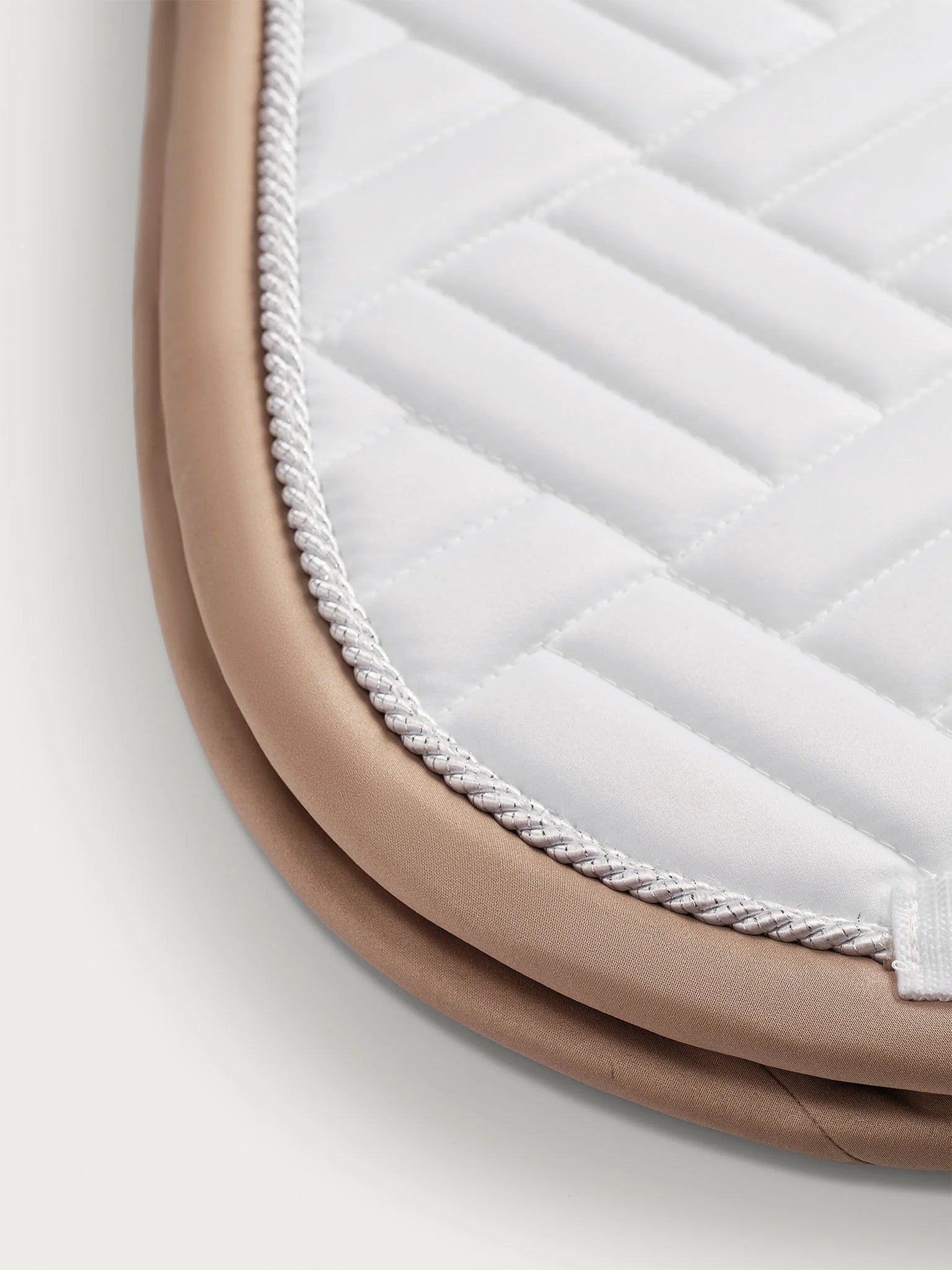 Elegant zadeldek met moderne stiksels in wit met zilveren en beige details. Versierd met het Equestrian Stockholm-logo in zilver. Het bamboemateriaal is het hele jaar door perfect dankzij de thermoregulerende werking - verkoelend in de zomer en verwarmend in de winter. Het droogt bovendien snel, voert vocht af en is antibacterieel. Combineer met andere items uit de Sand-collectie voor een stijlvolle look van top tot teen.