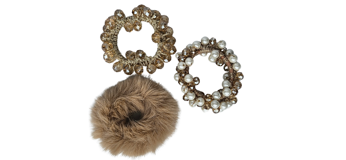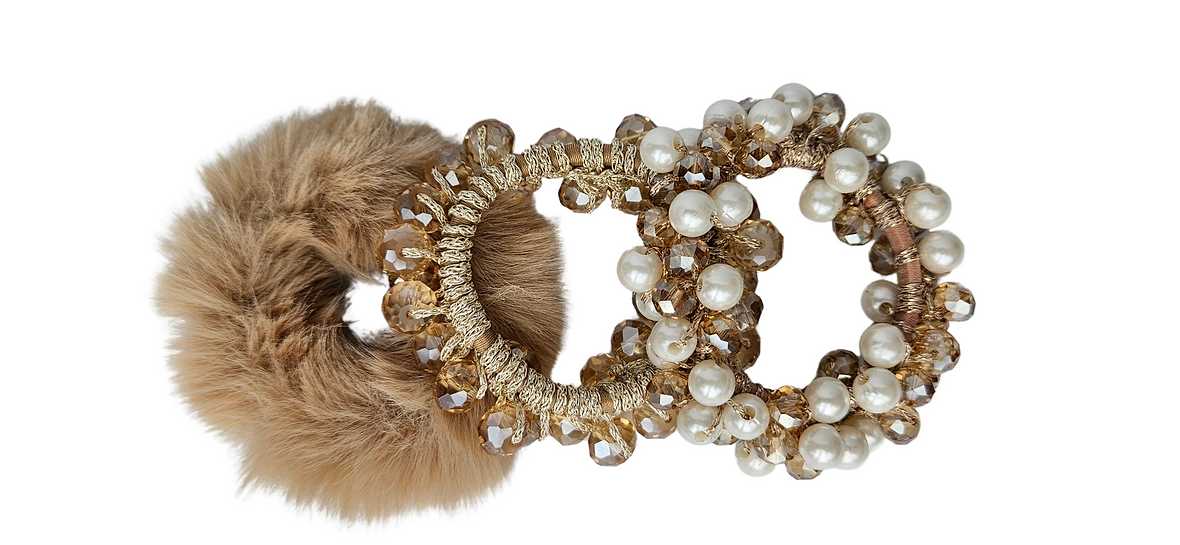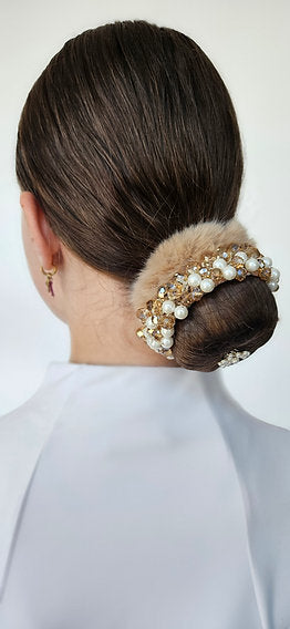 Setje champagne bestaat uit een beige kleur Equibun fluffy, beige kristal elasiek en een gaaf beige parel elastiek met kleine kristallen elastiek en een knotpin