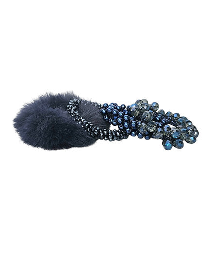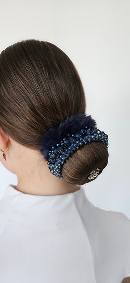 Setje navy bestaat uit 4 elastieken. Namelijk een navy kleur Equibun fluffy, parelelastiek, kristal elasiek, strass elastiek en een knotpin