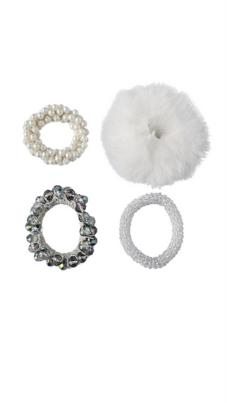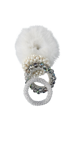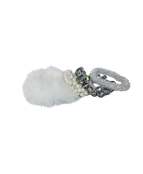 Setje wit bestaat uit een witte kleur Equibun fluffy, witte parelelastiek, wit kristal elasiek en wit strass elastiek en een knotpin