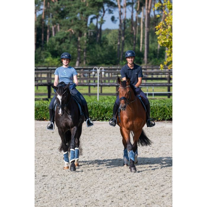 Deze geavanceerde beenbeschermers van Eskadron bieden ultiem comfort en bescherming voor je paard. Het ademende, driedimensionale multilayer mesh zorgt voor uitstekende ventilatie, terwijl de zachte faux fur binding wrijving voorkomt en extra comfort biedt. De dempende en drukverdelende eigenschappen beschermen tegen schuring en dragen bij aan een gelijkmatige drukverdeling. De robuuste binnenkant is versterkt met een PU-inzet en logo-embossing, wat de bescherming extra duurzaam maakt. De elastische klittenbanden met Eskadron logo-embossing zorgen voor een optimale pasvorm, en de softshell klittenbandhoes met Classic Sports-embleem geeft een stijlvolle afwerking. Dit product is bovendien gemakkelijk te onderhouden en wasbaar.