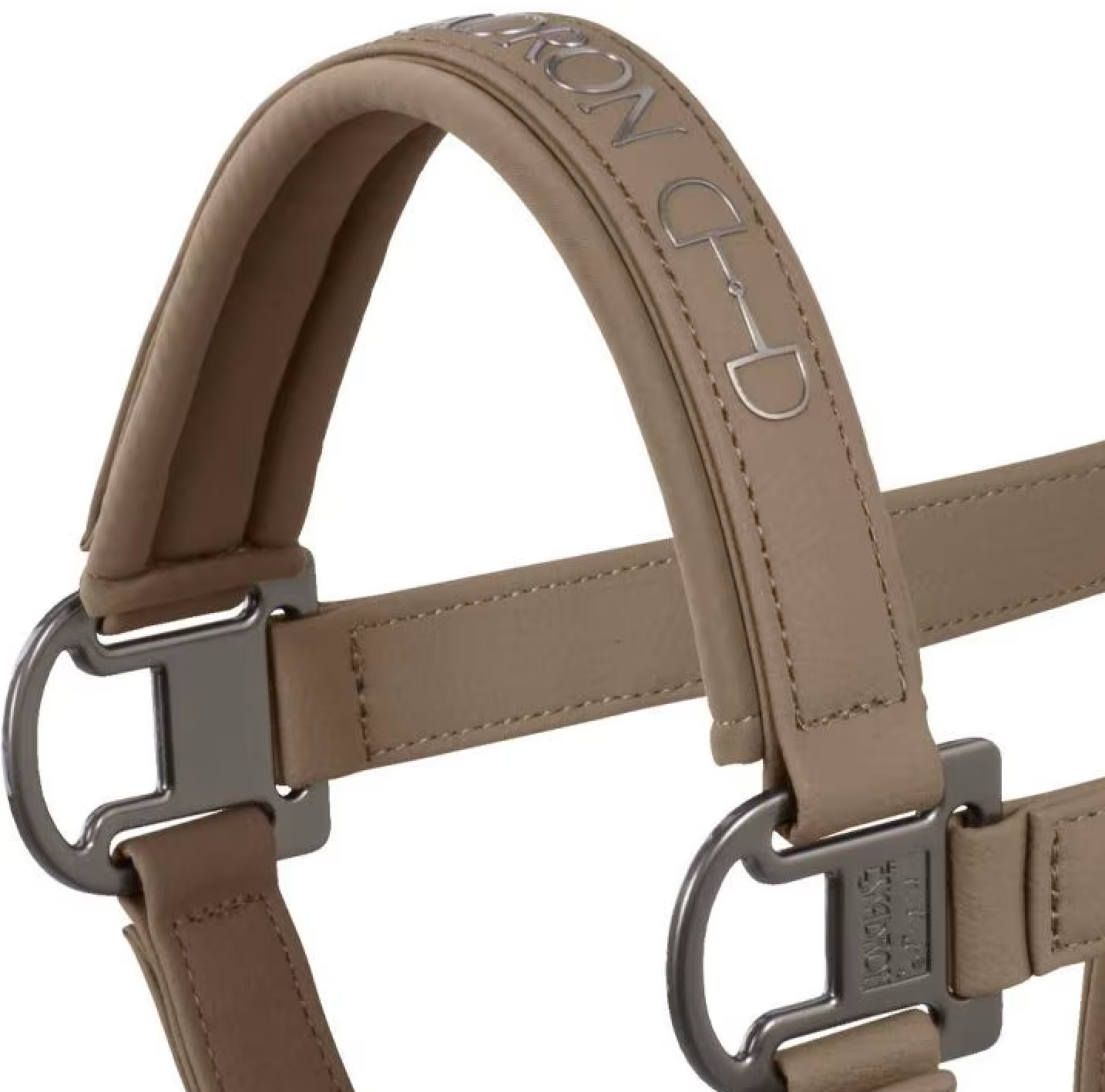 De taupekleurige metalen fournituren geven het halster een chique uitstraling. De verfijnde Platinum belettering op de neusriem en het metalen Eskadron-plaatje aan de linkerkant maken het geheel stijlvol af.