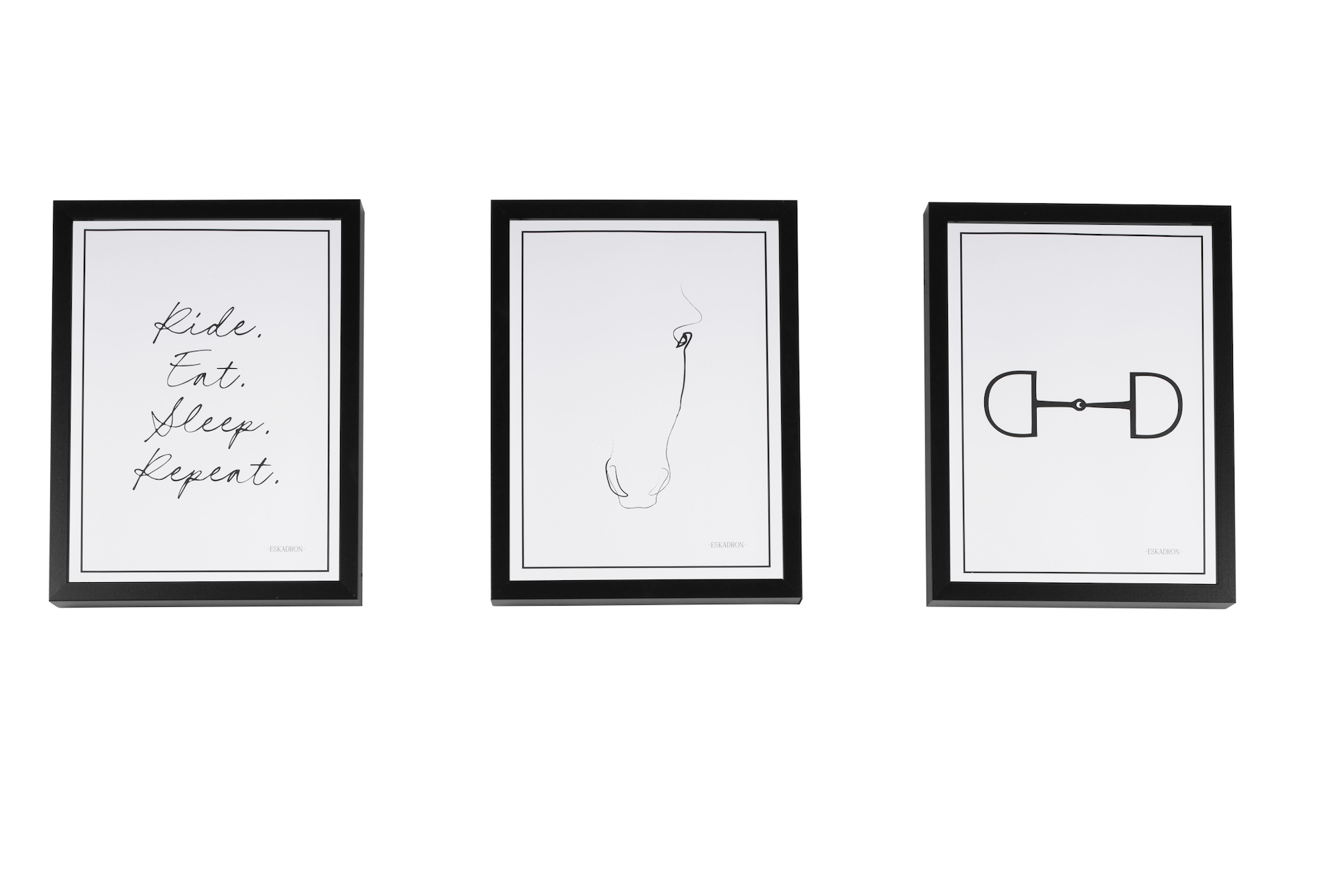 Breng stijl en sfeer in je stal, zadelkamer of thuis met deze wanddecoratie-set van 3 posters uit de Eskadron Platinum collectie. De set bestaat uit drie prints (zonder lijst) die perfect met elkaar te combineren zijn voor een moderne en elegante uitstraling. De posters hebben een formaat van A3 (29,7 x 42 cm) en worden zonder lijst geleverd, zodat je ze naar eigen smaak kunt inlijsten of ophangen.