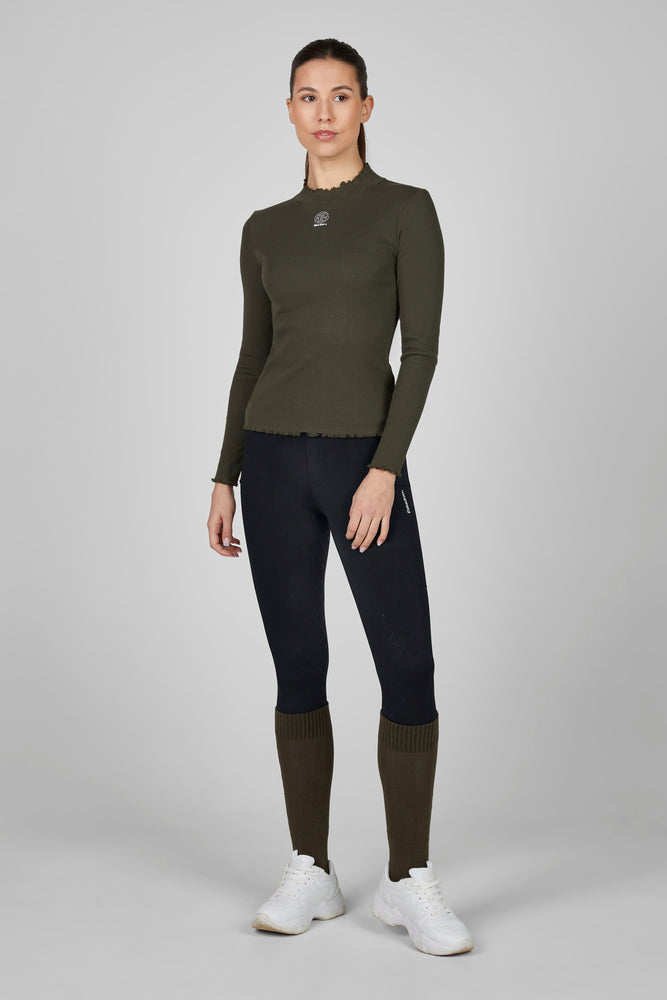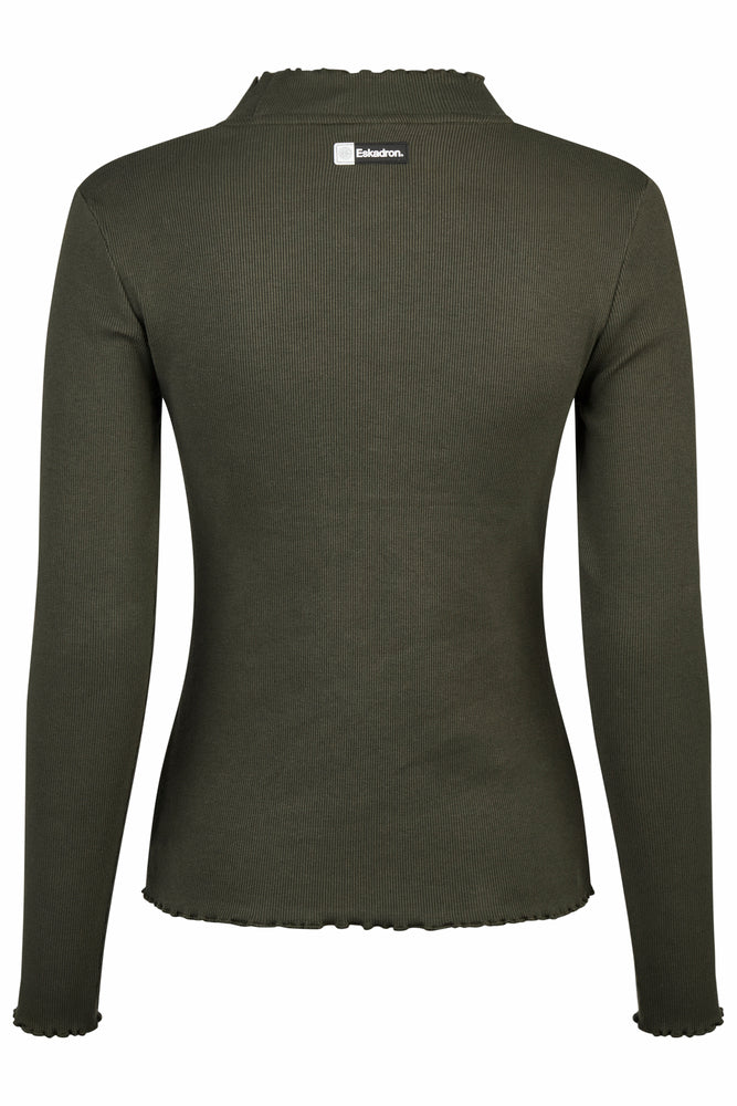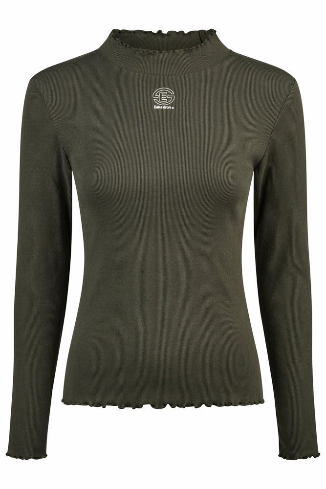 Deze elegante longsleeve is gemaakt van zacht katoen ribjersey en heeft een aansluitende pasvorm die mooi om het lichaam valt. De opstaande kraag en de subtiele ruches langs kraag, mouwen en zoom geven het shirt een vrouwelijke en stijlvolle uitstraling. Voorzien van een Eskadron-print op de voorkant en een bijpassend badge op de rug combineert deze longsleeve comfort met een moderne look.