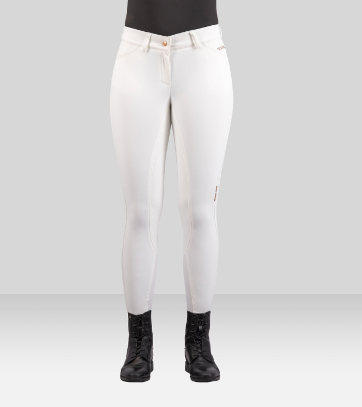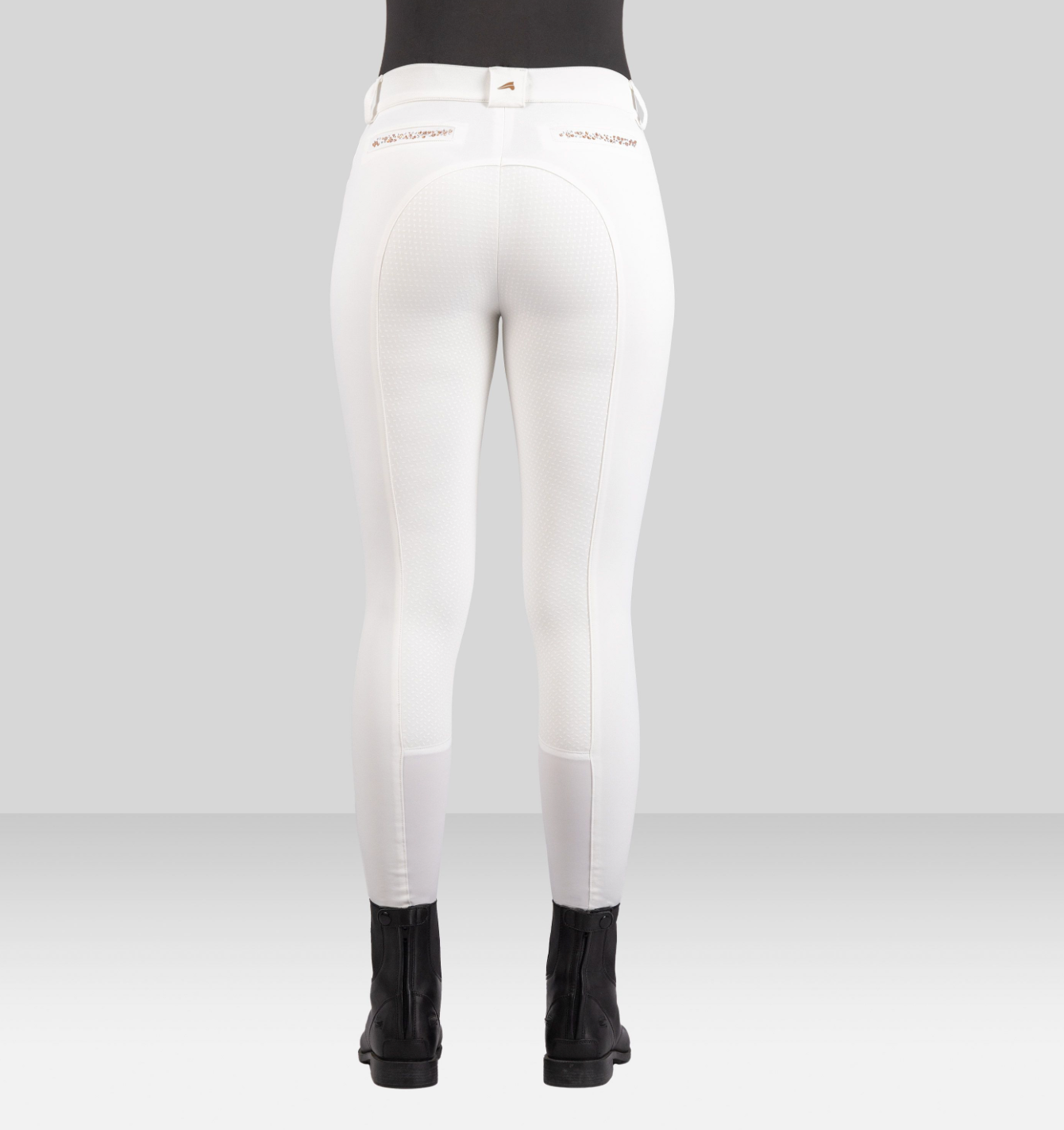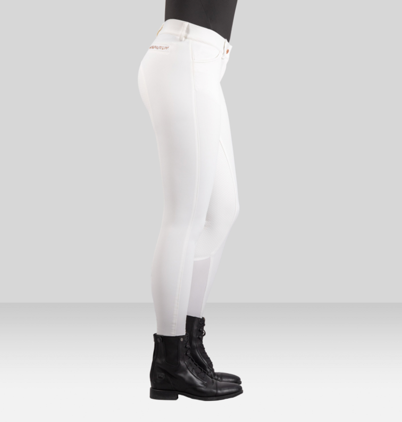Onze populaire en functionele rijbroek Arista in deze fashion-variant wordt gekenmerkt door delicate eyecatchers: kleine ton-sur-ton strass-applicaties op de voor- en achterzakken. Het materiaal aan de binnenkant is geruwd om te beschermen tegen de wind en koudere temperaturen. De innovatieve FullGrip siliconen rand zorgt voor een extra stevige grip in het zadel, zonder de bewegingsvrijheid van de ruiter te beperken. De elastische beenuiteinden en de lage tailleband dragen bij aan het comfort van de ruiter.