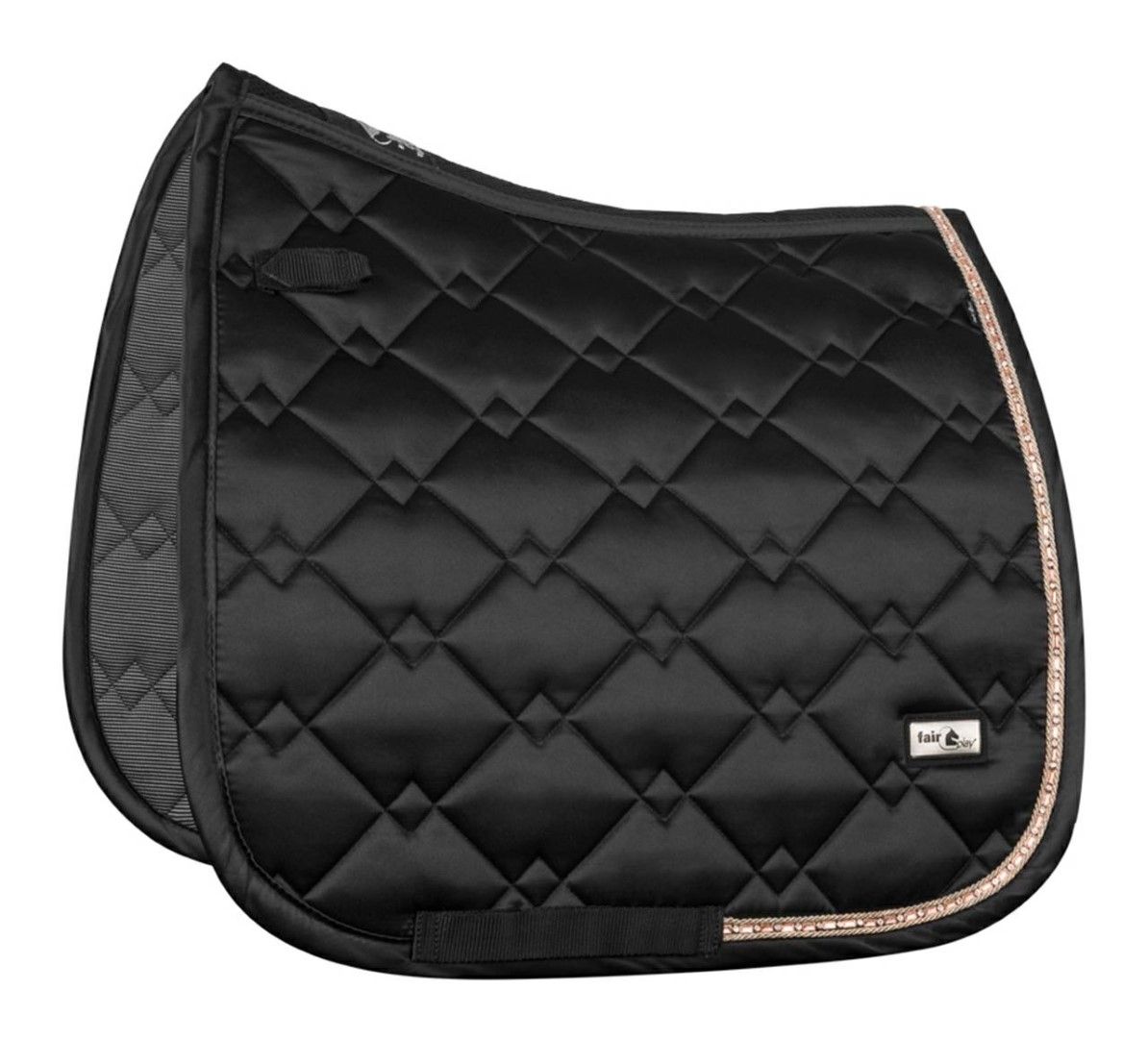 Chique satijnen dekje van Fair Play van hoge kwaliteit! Het dekje heeft een mooi patroon en is gedecoreerd met een dubbele crystallen bies. Daarnaast heeft het een open ruggegraat met 3D air mesh voor een verhoogde ventilatie en heeft het een voering met speciaal CERAMIC-tech™ materiaal voor een verhoogde doorbloeding en spierherstel.