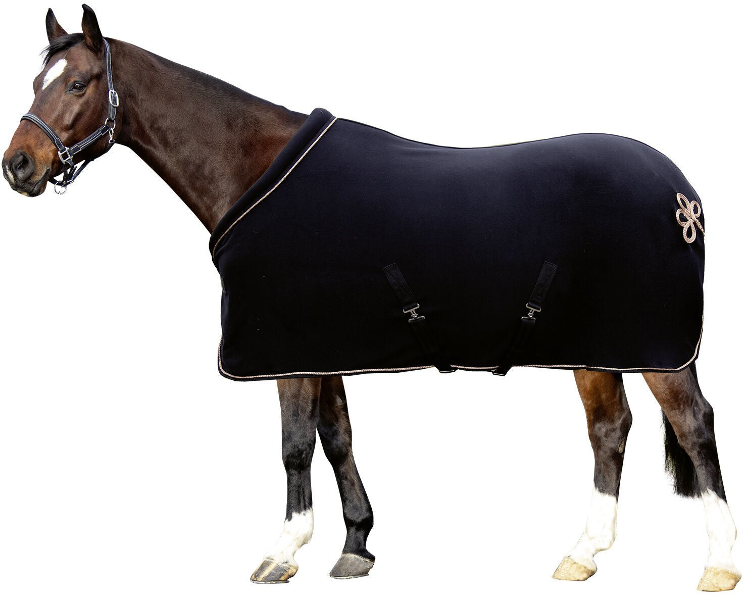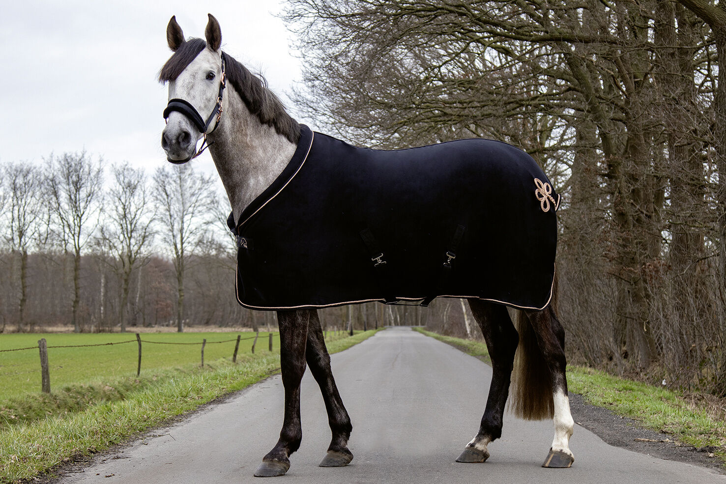 De cooler Rosegold Glamour Style combineert maximale functionaliteit met een elegant design en biedt het paard ideale ondersteuning na de training. De deken overtuigt door zijn ademende eigenschappen en optimale zweetabsorptiecapaciteit en bevordert zo het welzijn van het paard. Dankzij de verstelbare en afneembare kruissingels met metalen sluitingen kan de cooler eenvoudig worden aangepast aan de pasvorm van het paard. De staartriem biedt bovendien extra ondersteuning, zodat de deken ook bij intensieve bewegingen betrouwbaar op zijn plaats blijft. De rand van de deken is afgewerkt met een decoratief koord. Een ander hoogtepunt is het elegante roségouden detail aan de achterkant van de deken, dat het luxueuze design als blikvanger afrondt.