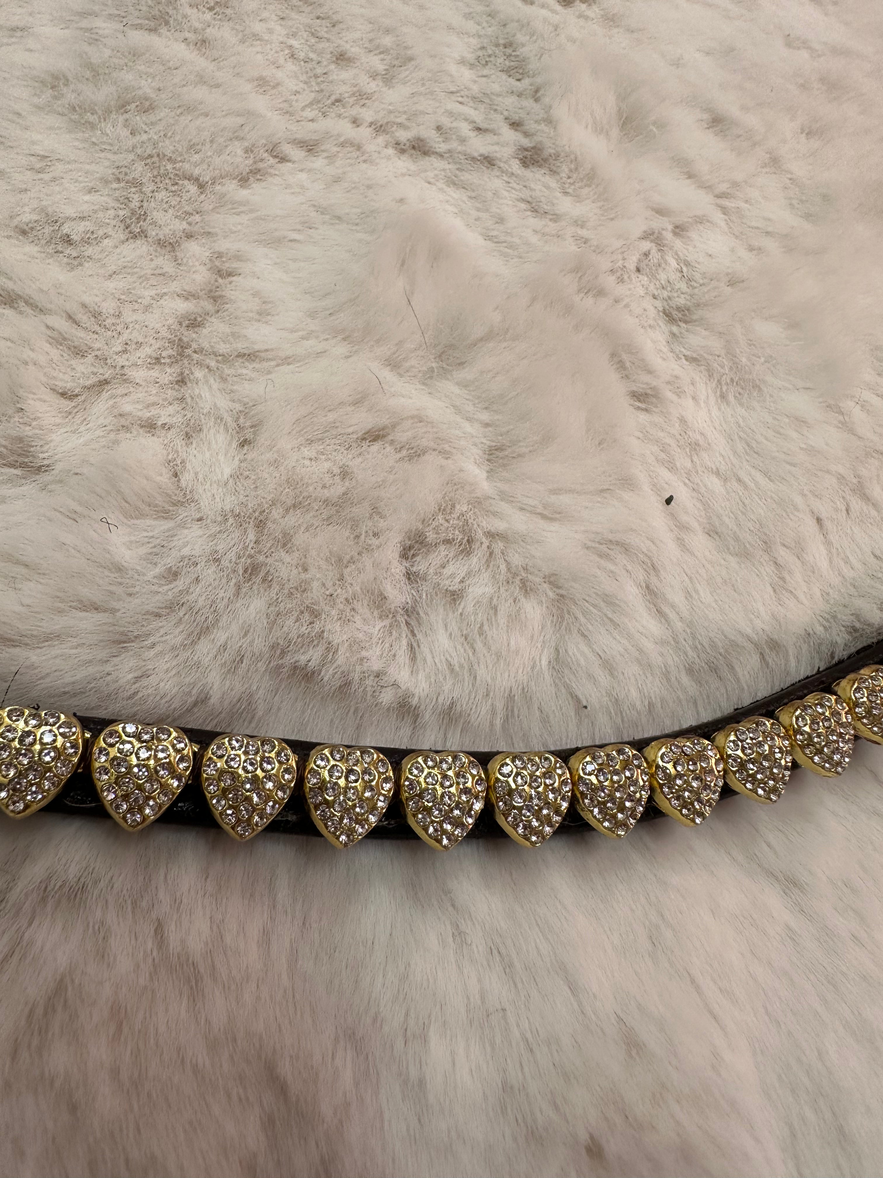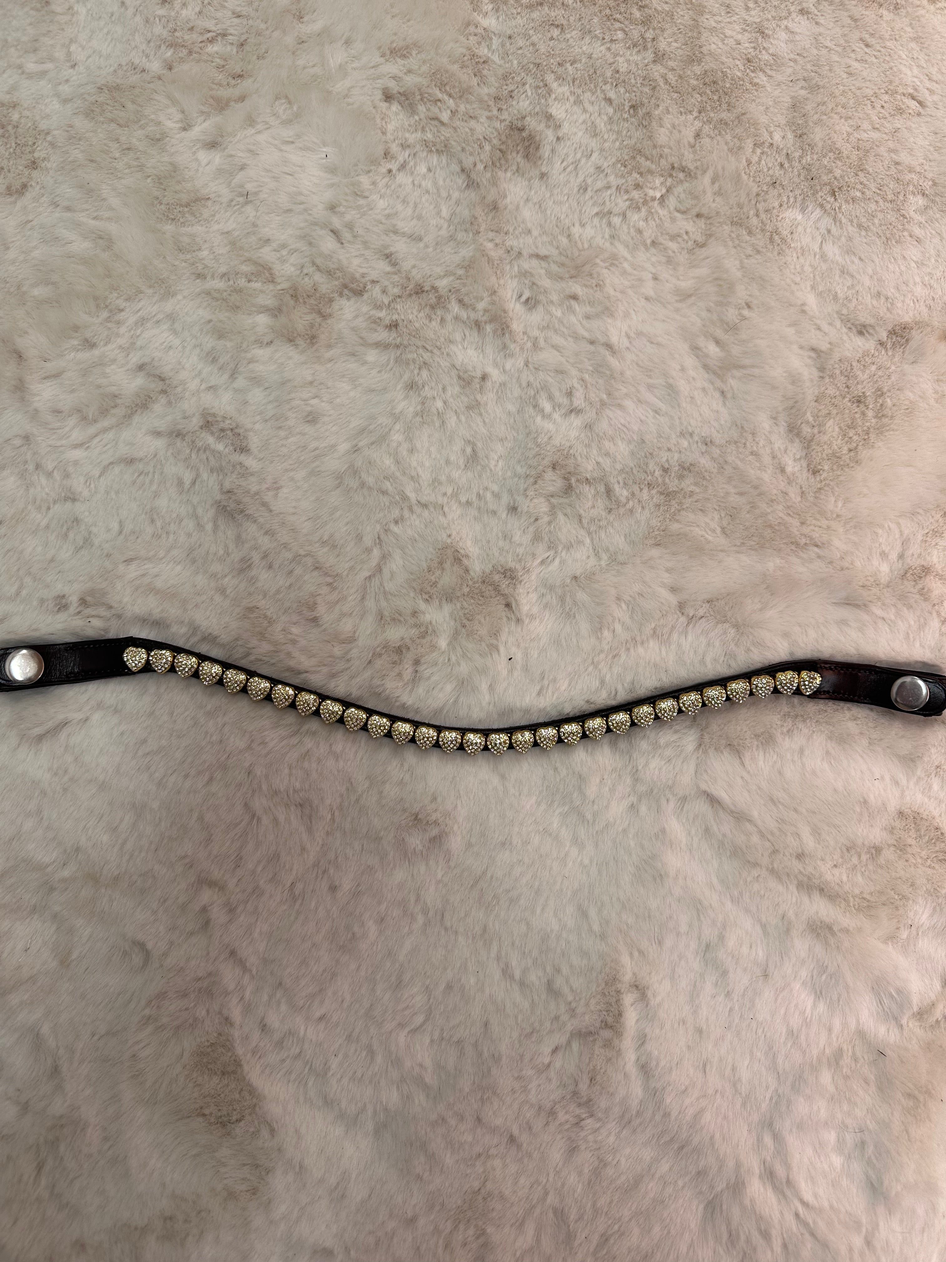 Deze stijlvolle frontriem is versierd met schitterende bling steentjes in een elegante golfvorm. Het voegt een vleugje glamour en verfijning toe aan het hoofdstel, terwijl het een subtiele, maar opvallende uitstraling heeft. Perfect voor paardenliefhebbers die hun rijuitrusting willen verfraaien met een luxueuze, moderne touch.