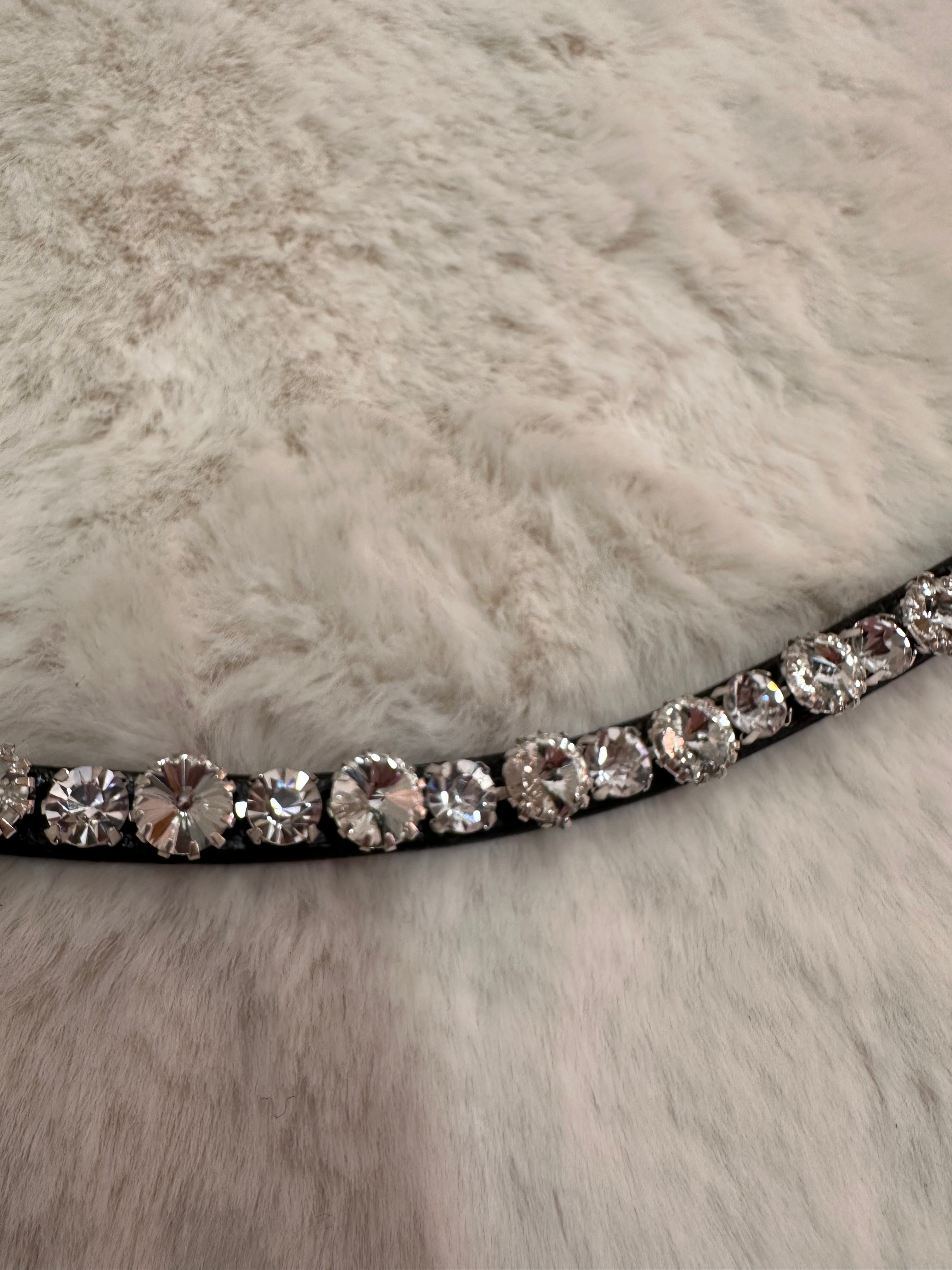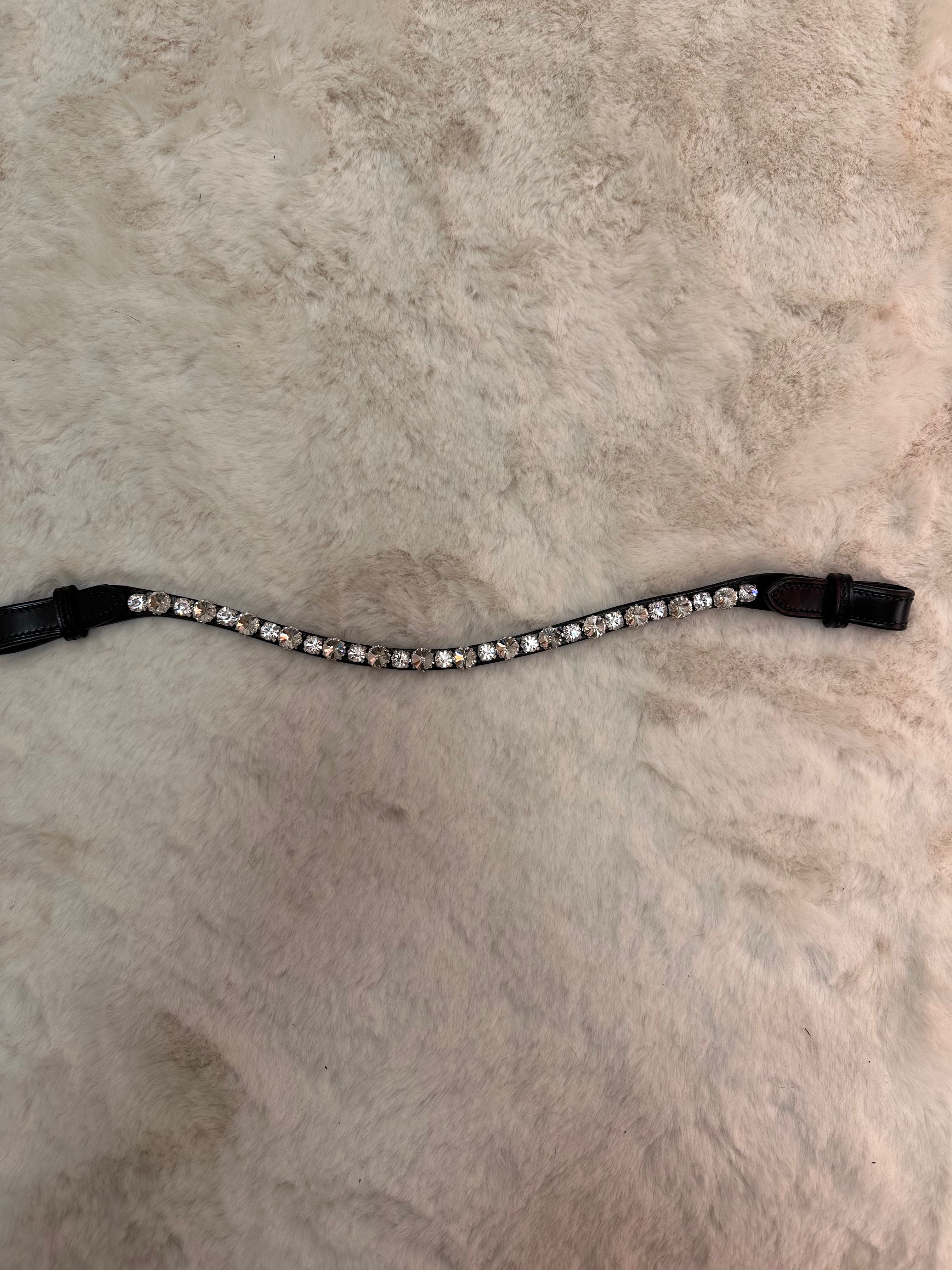 Deze stijlvolle frontriem is versierd met schitterende bling steentjes in een elegante golfvorm. Het voegt een vleugje glamour en verfijning toe aan het hoofdstel, terwijl het een subtiele, maar opvallende uitstraling heeft. Perfect voor paardenliefhebbers die hun rijuitrusting willen verfraaien met een luxueuze, moderne touch.