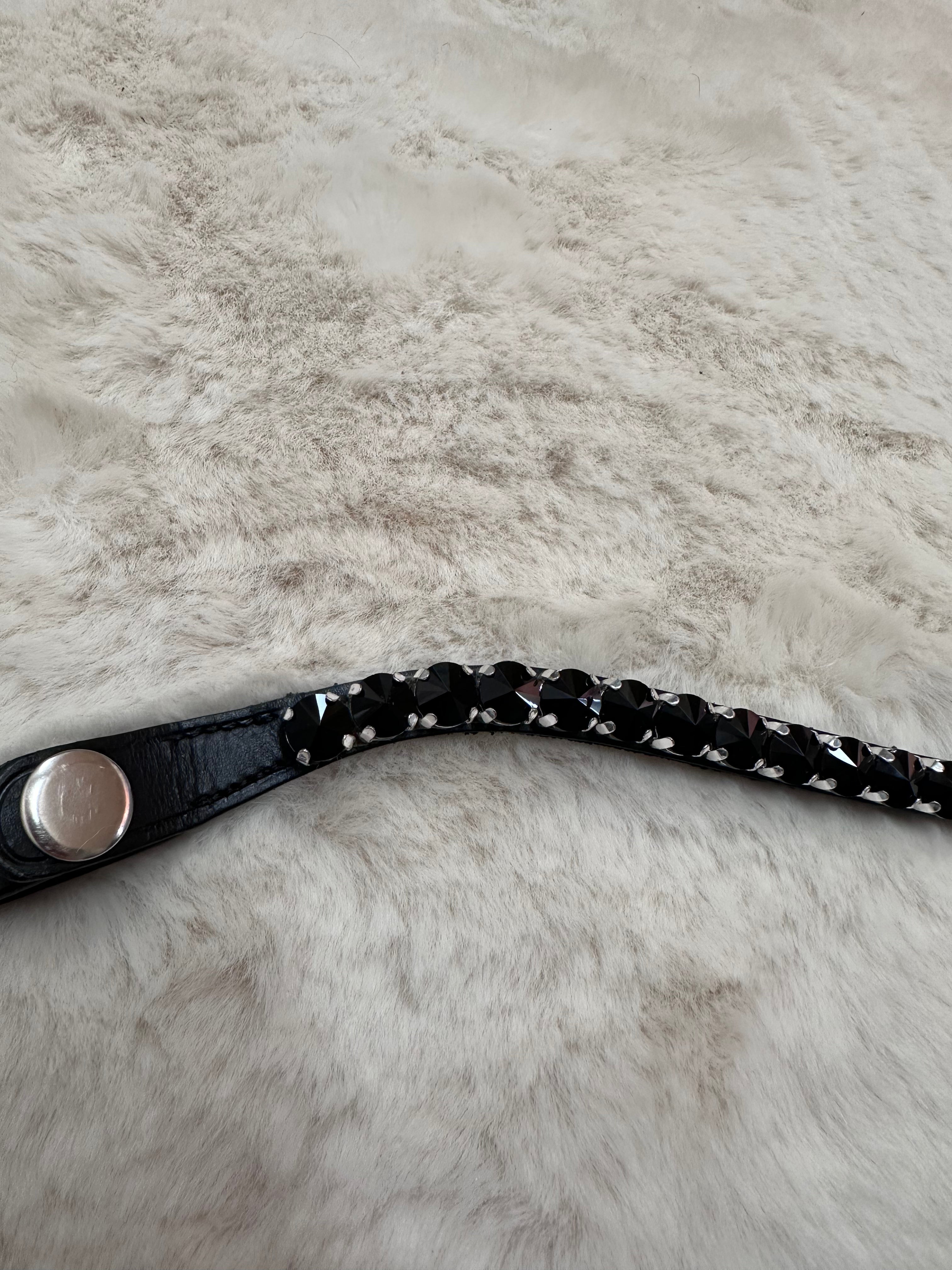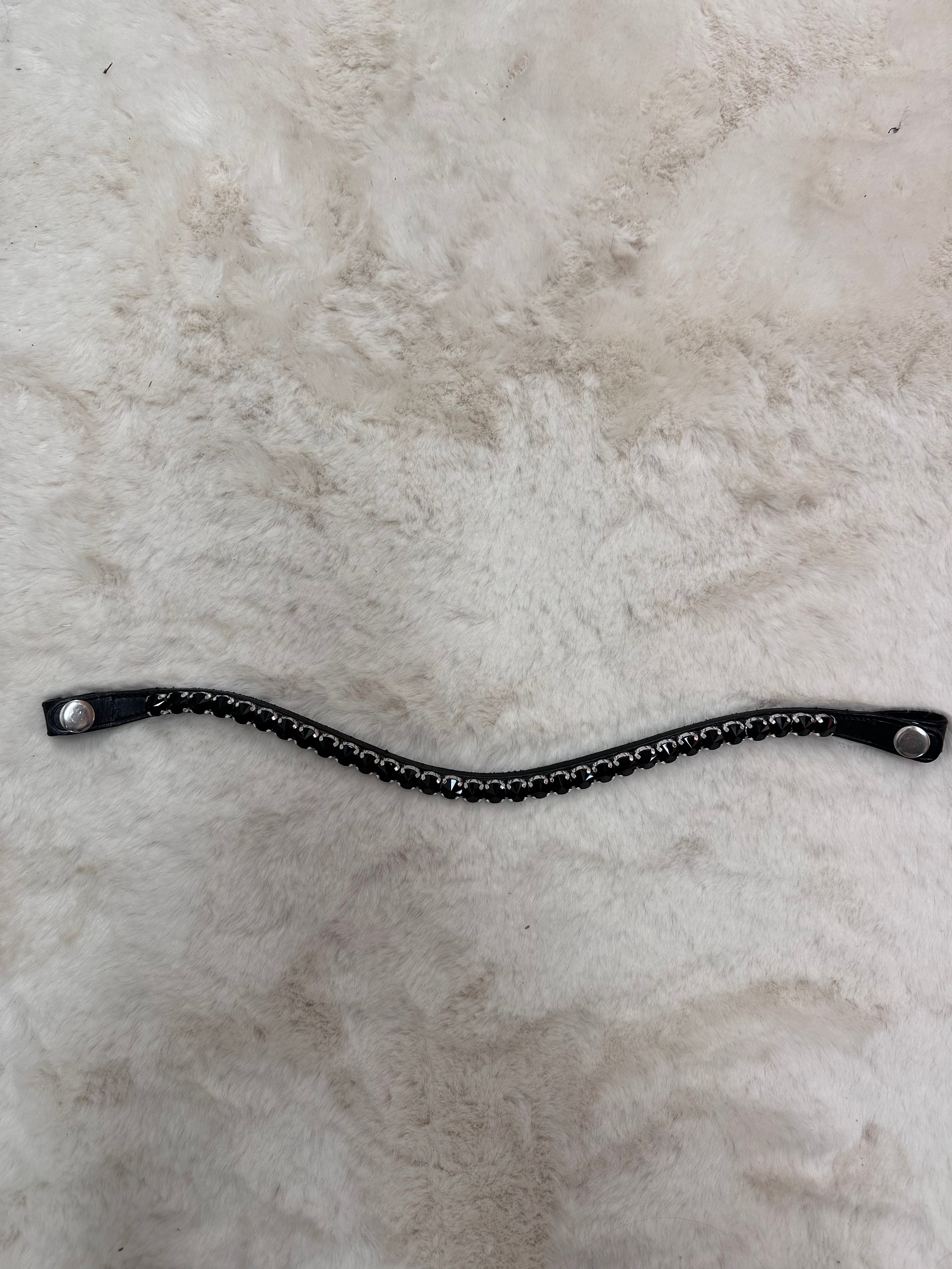 Deze stijlvolle frontriem is versierd met schitterende bling steentjes in een elegante golfvorm. Het voegt een vleugje glamour en verfijning toe aan het hoofdstel, terwijl het een subtiele, maar opvallende uitstraling heeft. Perfect voor paardenliefhebbers die hun rijuitrusting willen verfraaien met een luxueuze, moderne touch.