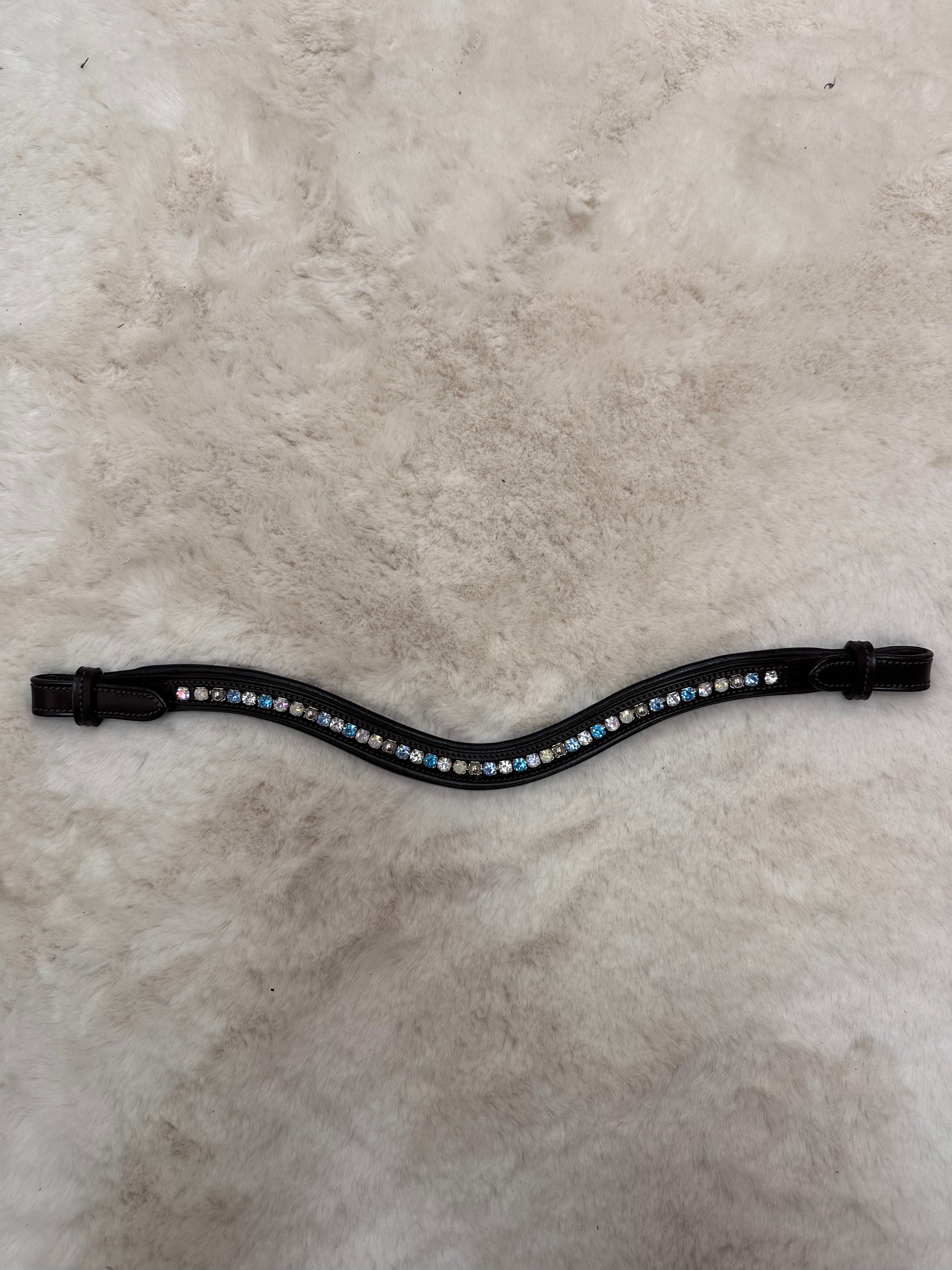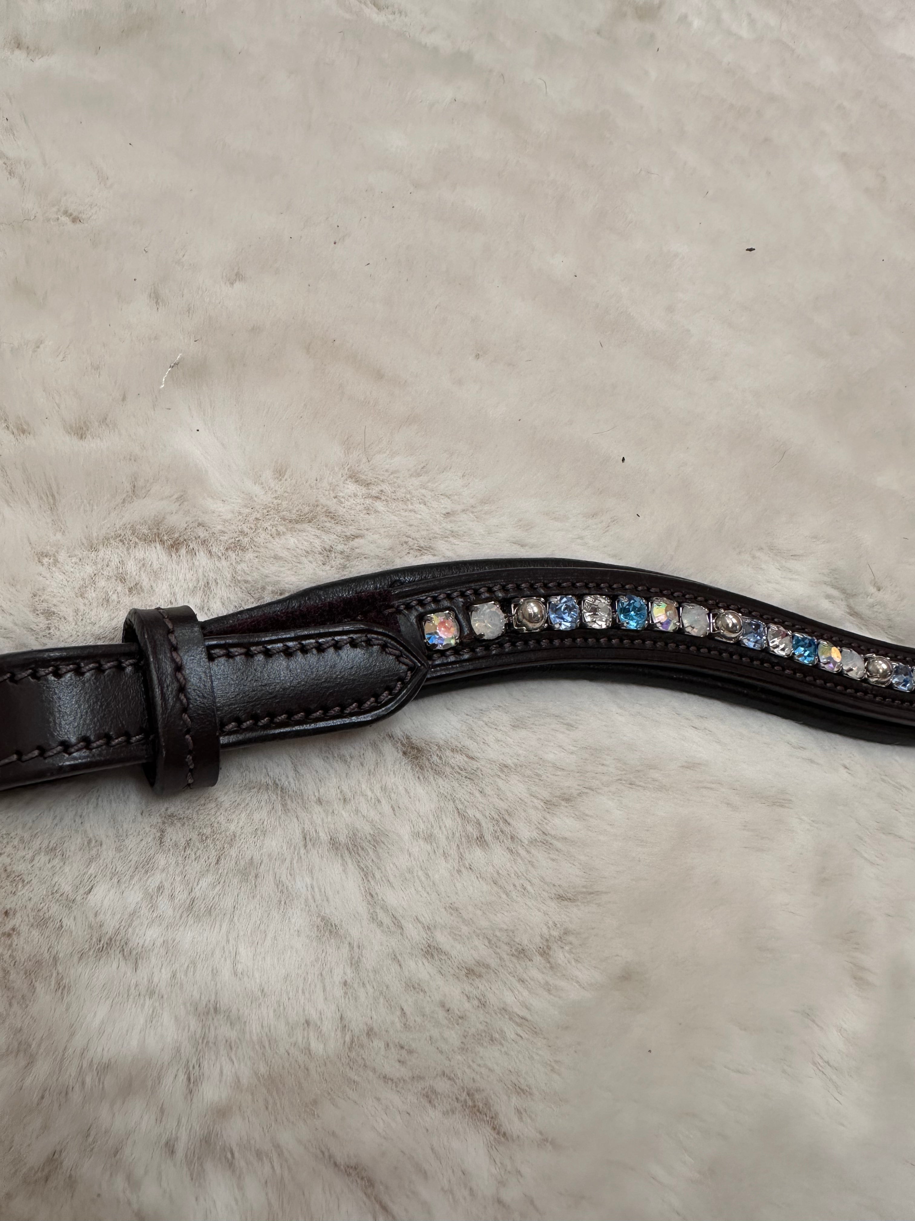 Deze stijlvolle frontriem is versierd met schitterende bling steentjes in een elegante golfvorm. Het voegt een vleugje glamour en verfijning toe aan het hoofdstel, terwijl het een subtiele, maar opvallende uitstraling heeft. Perfect voor paardenliefhebbers die hun rijuitrusting willen verfraaien met een luxueuze, moderne touch.