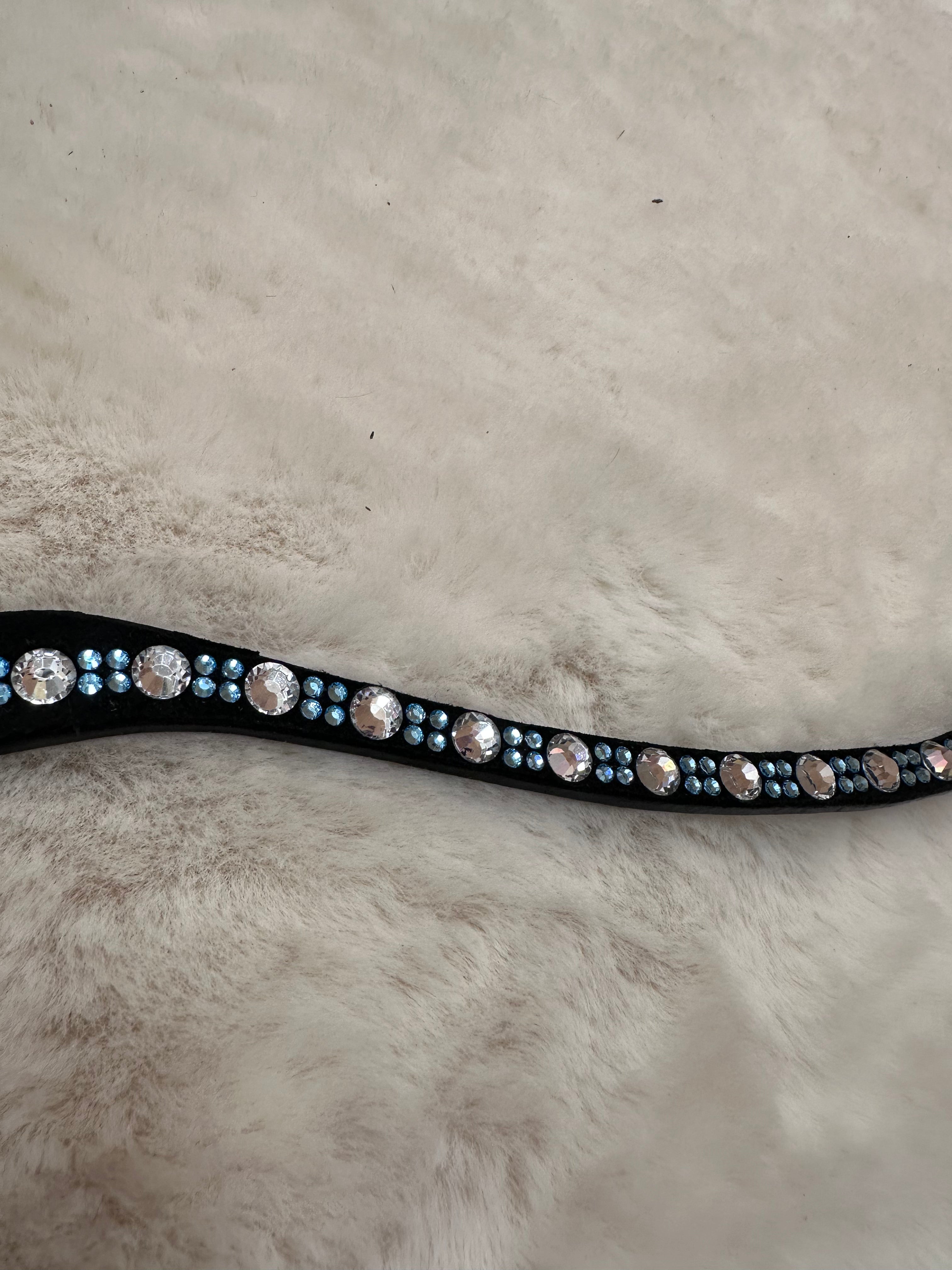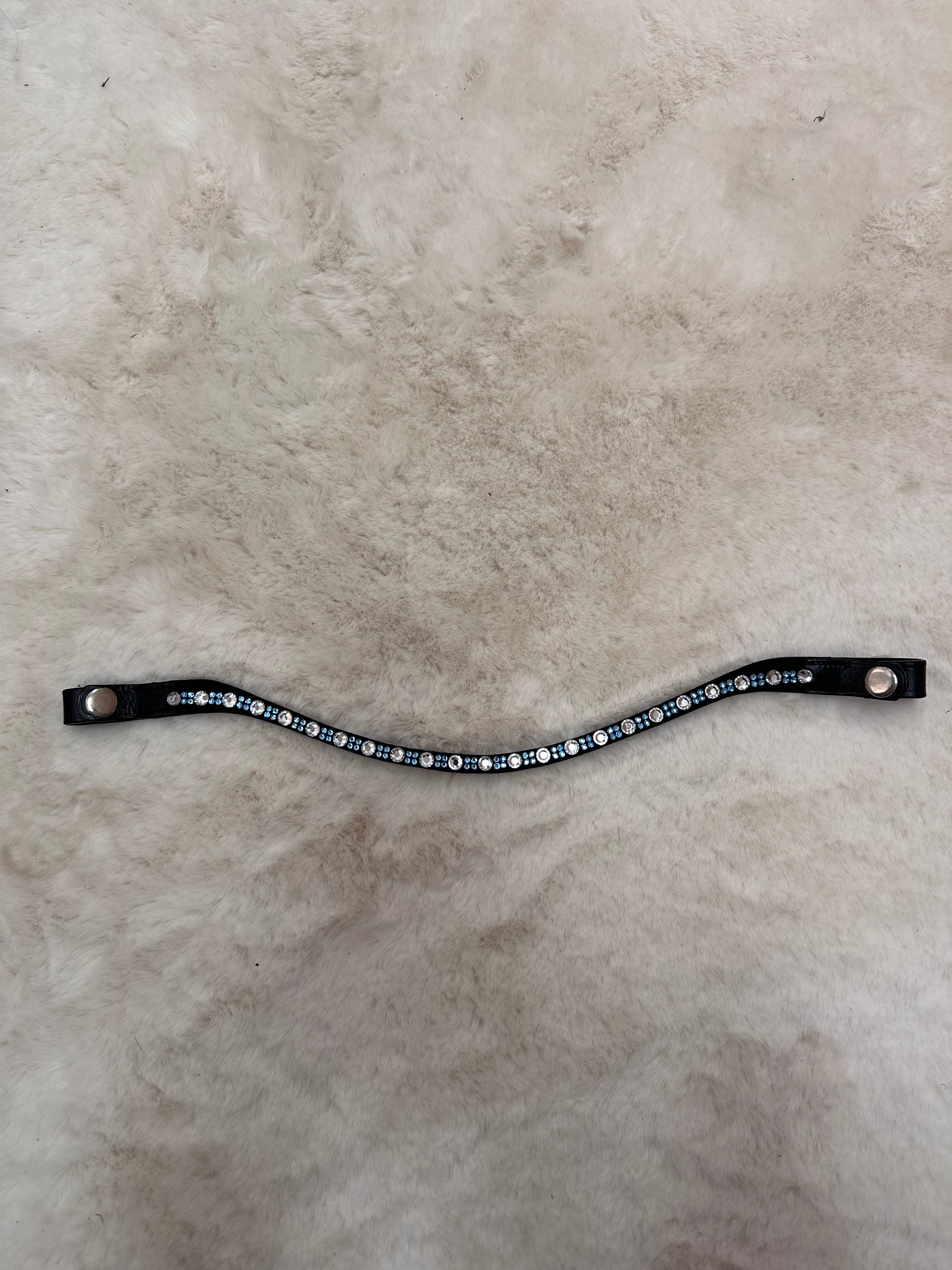 Deze stijlvolle frontriem is versierd met schitterende bling steentjes in een elegante golfvorm. Het voegt een vleugje glamour en verfijning toe aan het hoofdstel, terwijl het een subtiele, maar opvallende uitstraling heeft. Perfect voor paardenliefhebbers die hun rijuitrusting willen verfraaien met een luxueuze, moderne touch.