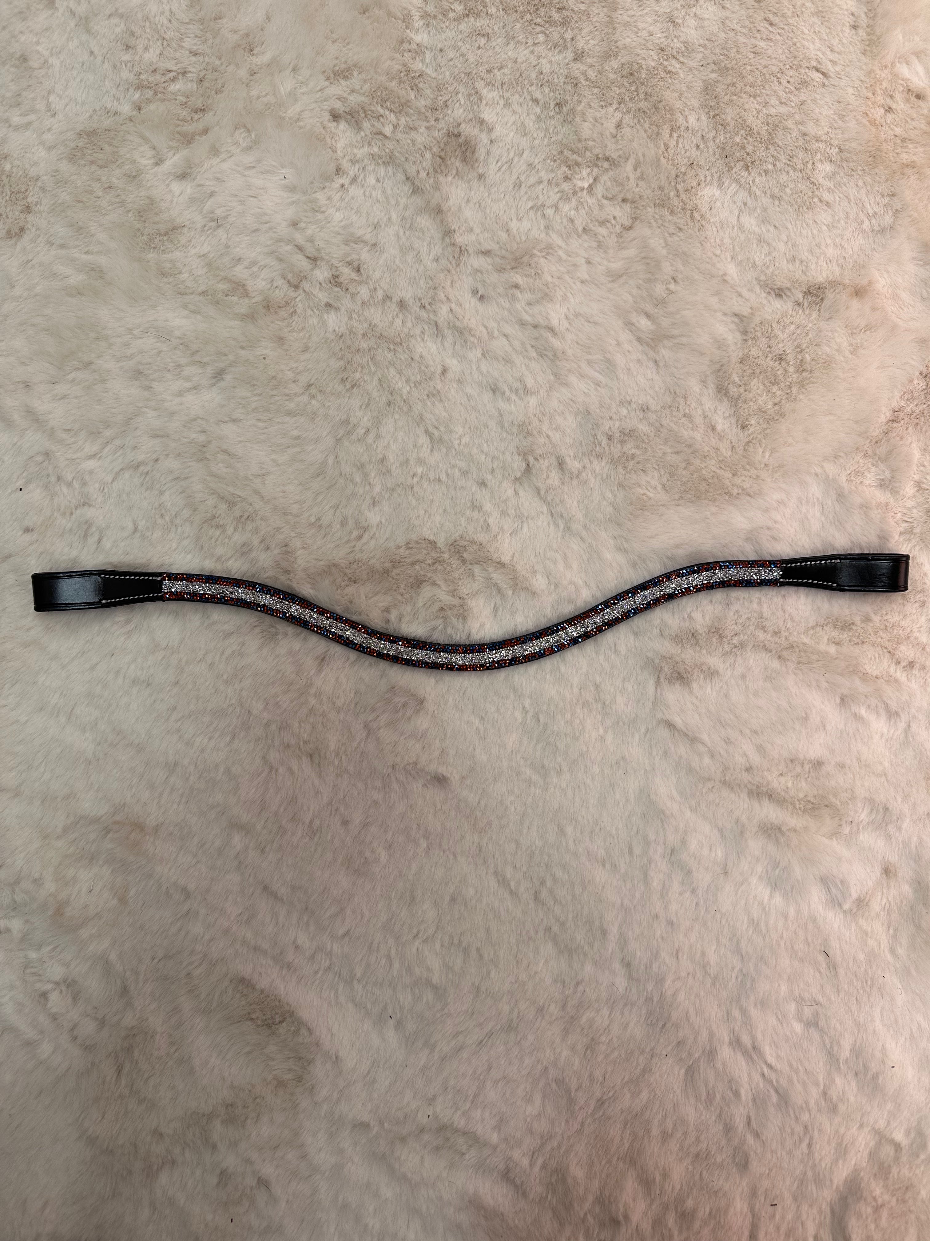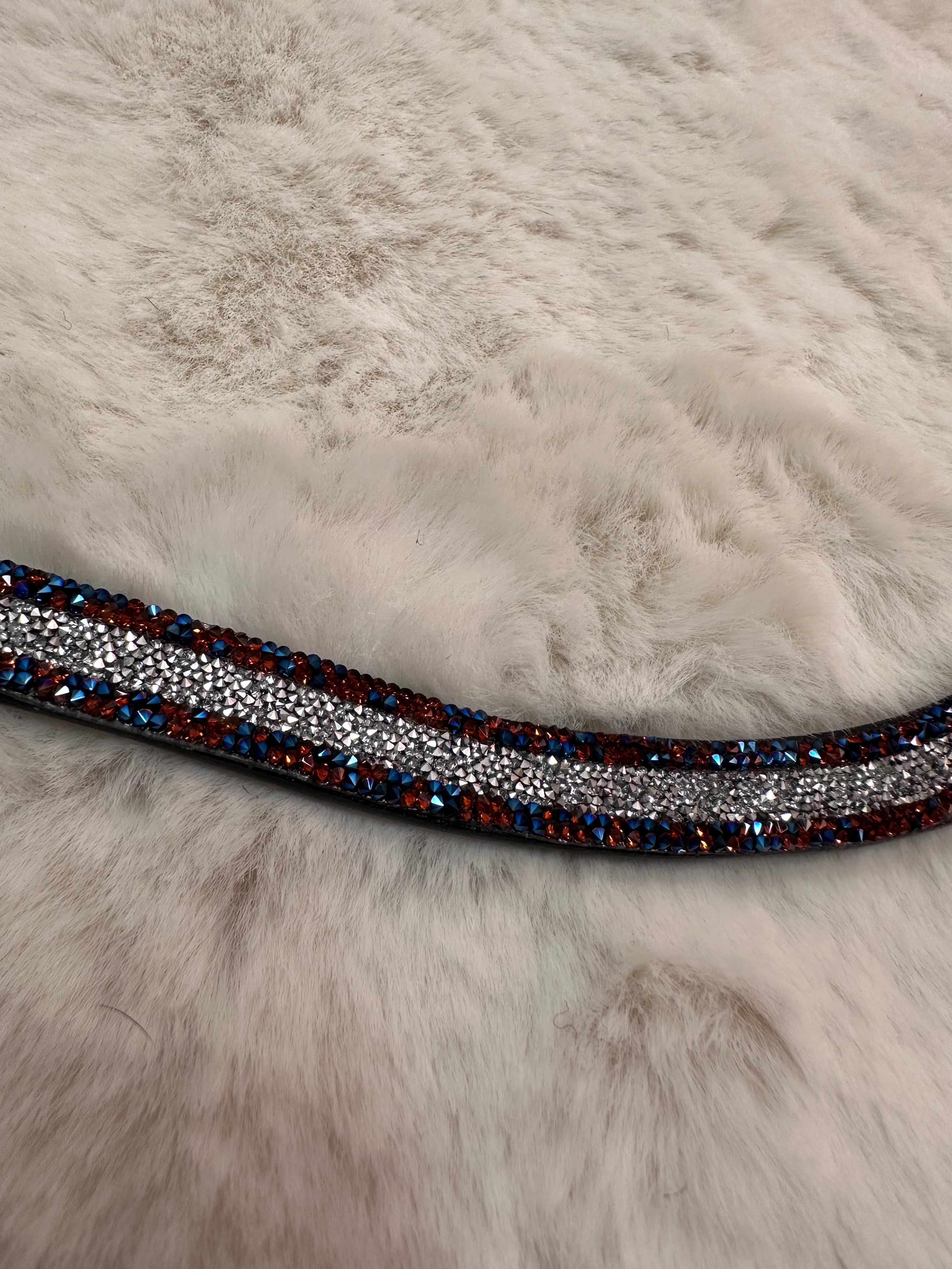 Deze stijlvolle frontriem is versierd met schitterende bling steentjes in een elegante golfvorm. Het voegt een vleugje glamour en verfijning toe aan het hoofdstel, terwijl het een subtiele, maar opvallende uitstraling heeft. Perfect voor paardenliefhebbers die hun rijuitrusting willen verfraaien met een luxueuze, moderne touch.
