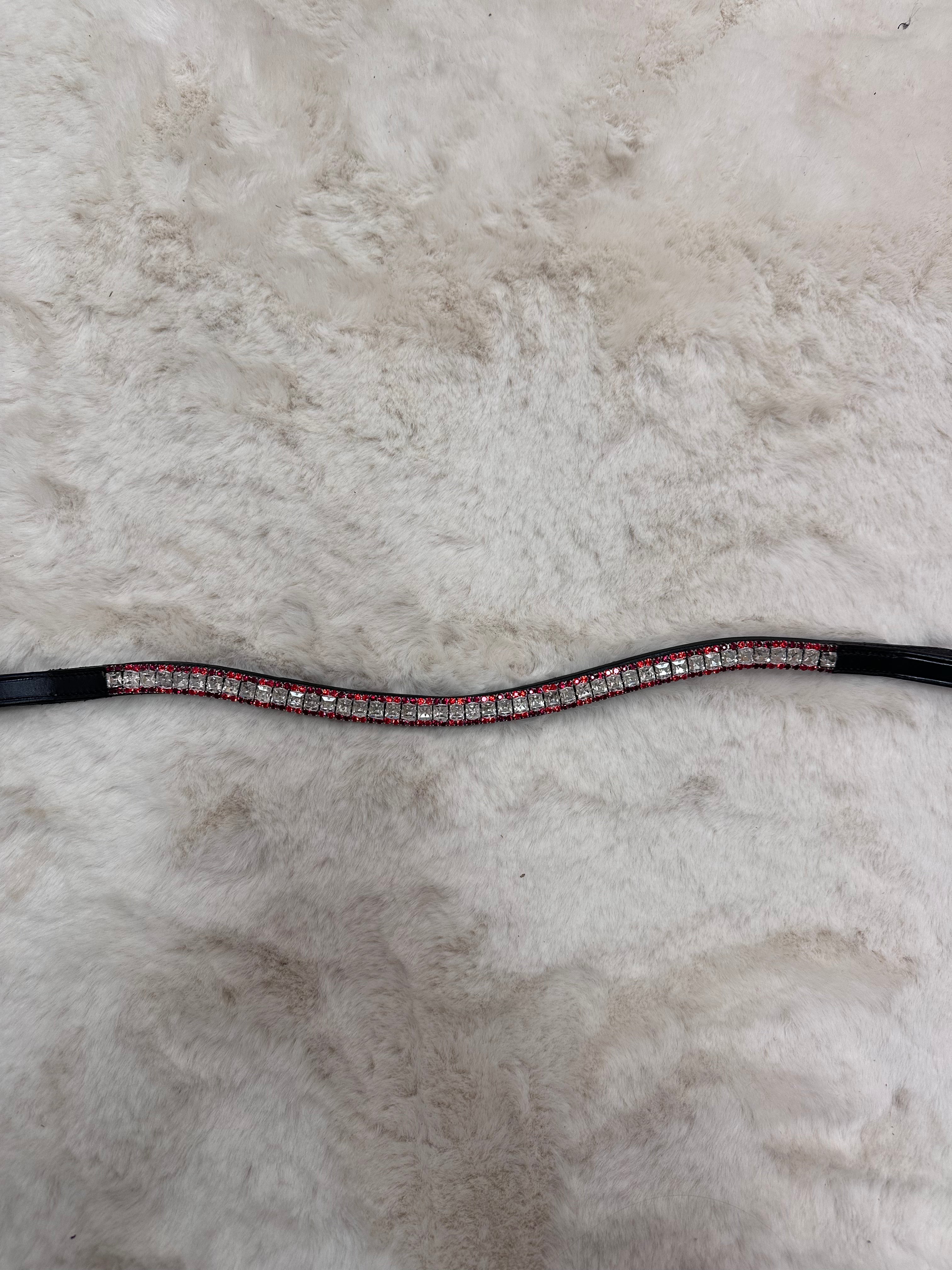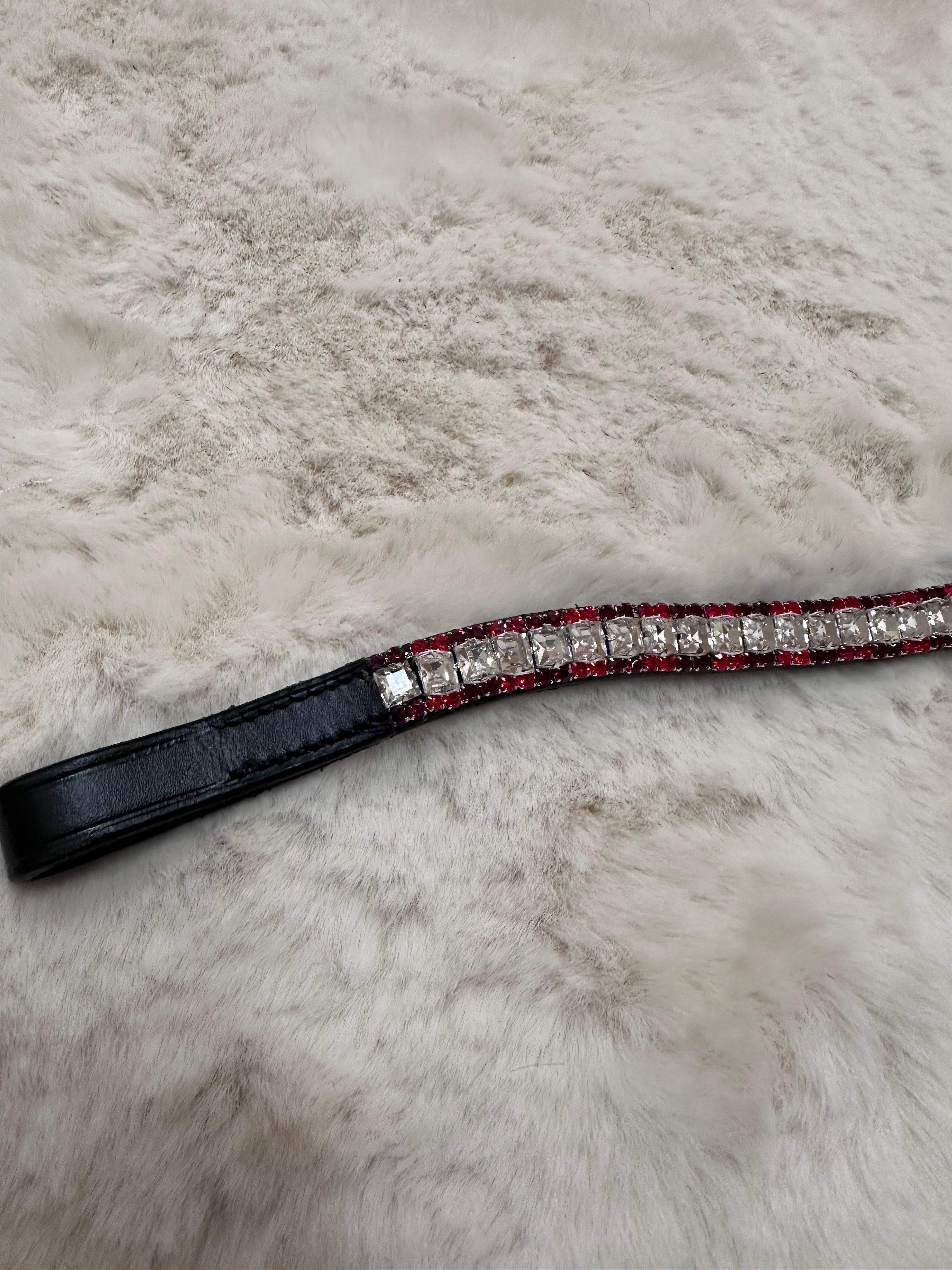 Deze stijlvolle frontriem is versierd met schitterende bling steentjes in een elegante golfvorm. Het voegt een vleugje glamour en verfijning toe aan het hoofdstel, terwijl het een subtiele, maar opvallende uitstraling heeft. Perfect voor paardenliefhebbers die hun rijuitrusting willen verfraaien met een luxueuze, moderne touch.