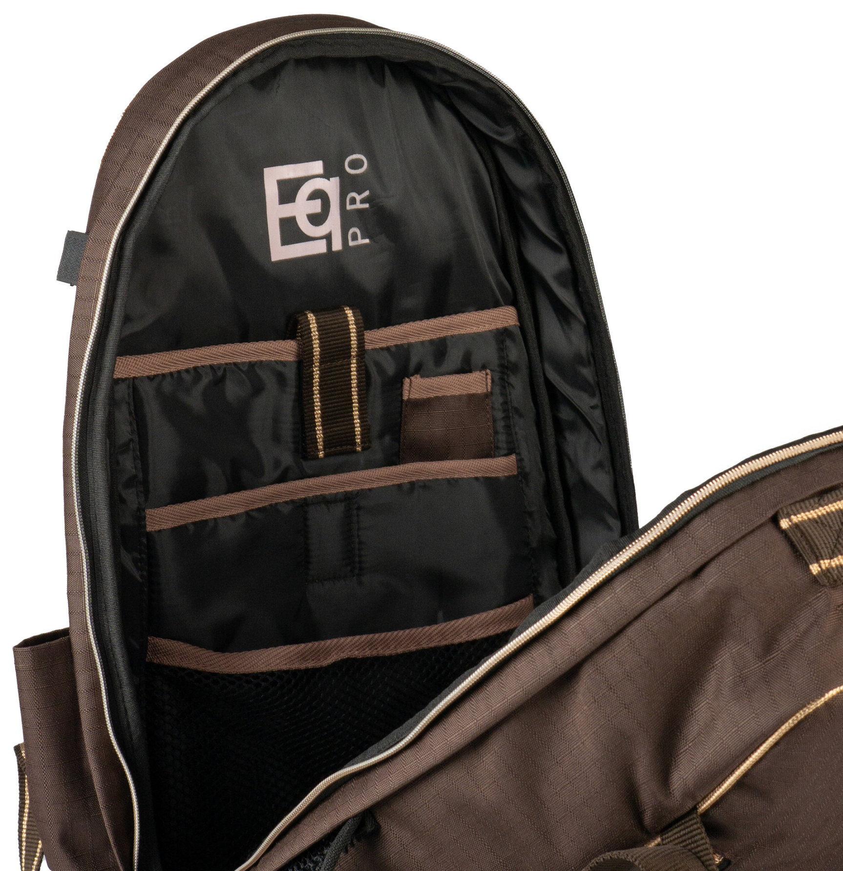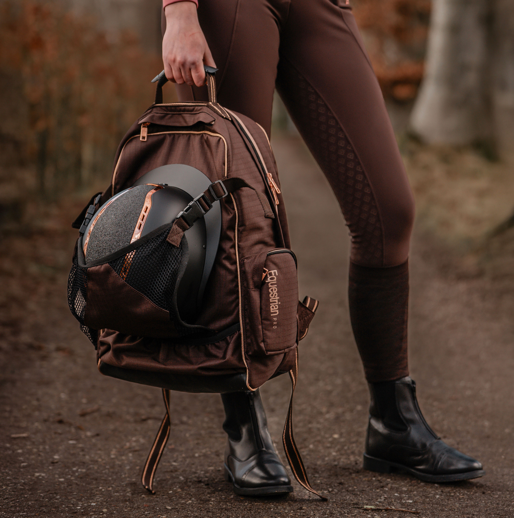 Praktische rugzak speciaal voor ruiters met handige binnen- en buitenvakken, verstelbare schouderbanden en een verstevigde bodem. Het voorvak is ideaal om je helm in mee te nemen. Het elegante Equestrian Pro-ontwerp met roségouden details geeft de rugzak een stijlvolle uitstraling.