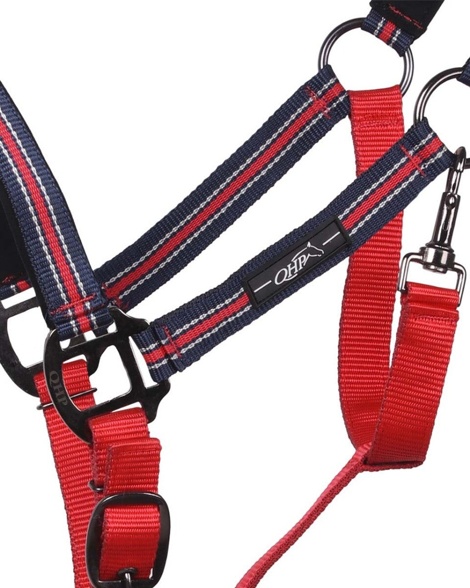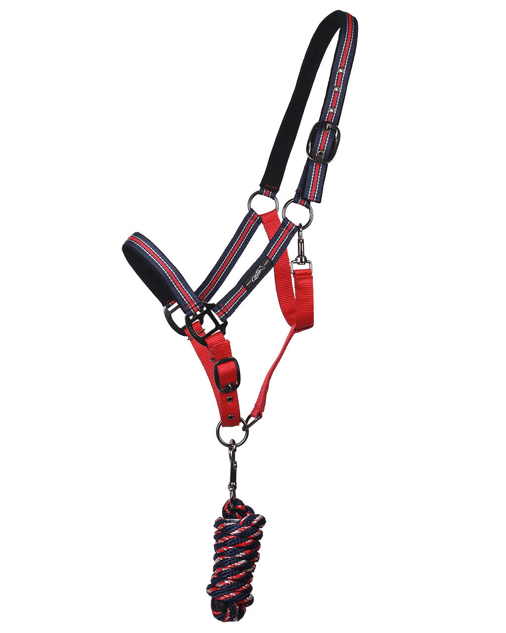 Gevoerd halster gedecoreerd met een gestreept patroon. Voorzien van luxe zwart metalen fournituren. Geleverd met een bijpassend gekleurd touw en een herbruikbare draagtas met rits.
