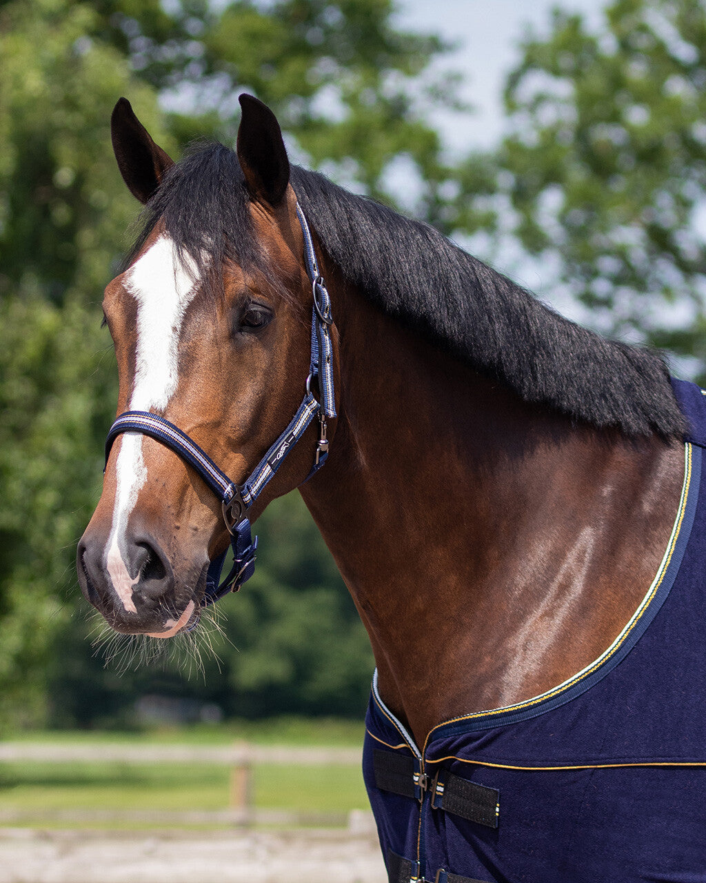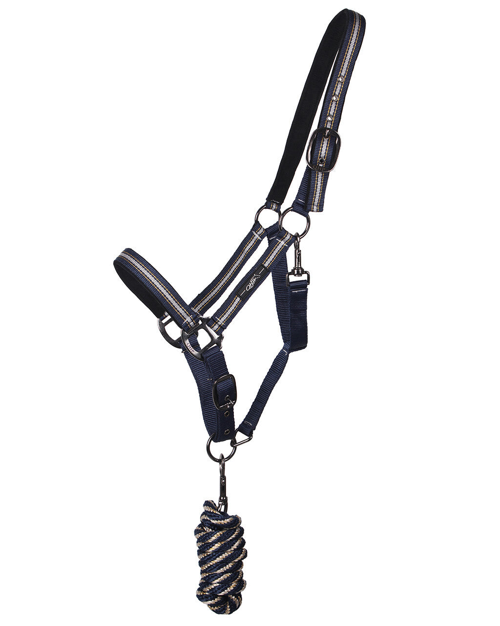 Gevoerd halster gedecoreerd met een gestreept patroon. Voorzien van luxe zwart metalen fournituren. Geleverd met een bijpassend gekleurd touw en een herbruikbare draagtas met rits.
