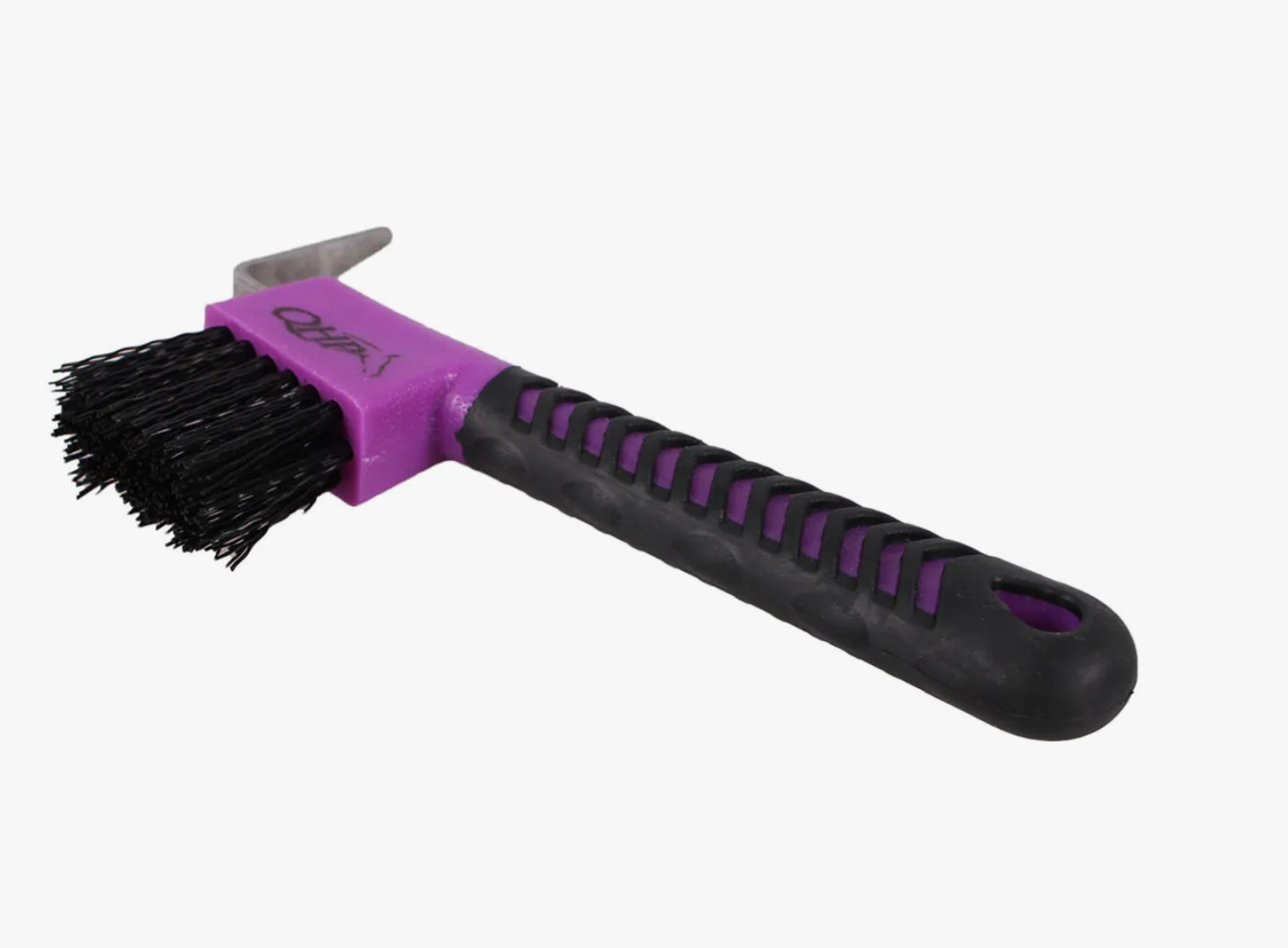 Paarse hoevenkrabber met zwart rubberen handvat, zodat het fijn in de hand ligt. Met borsteltje en QHP opdruk.