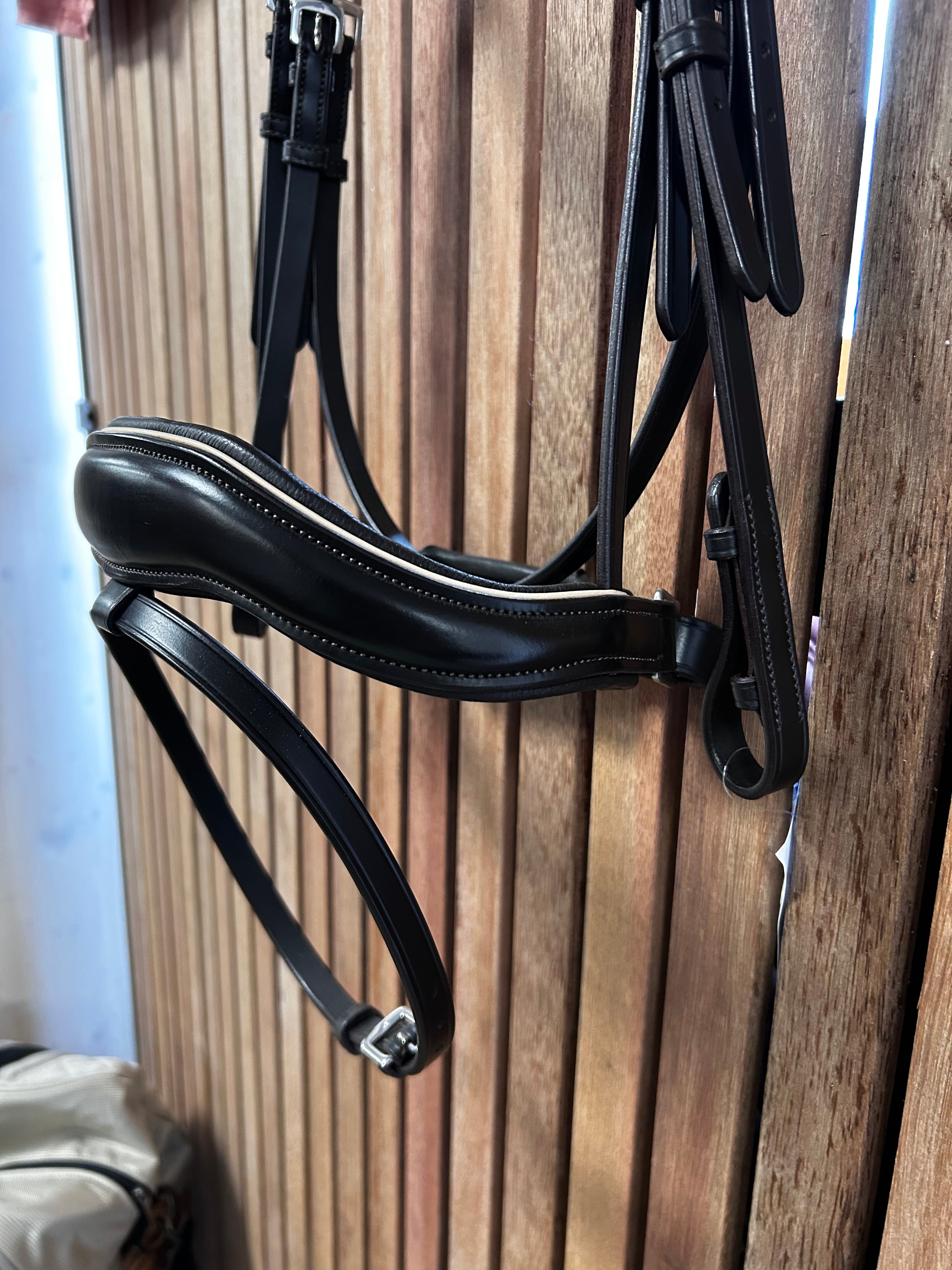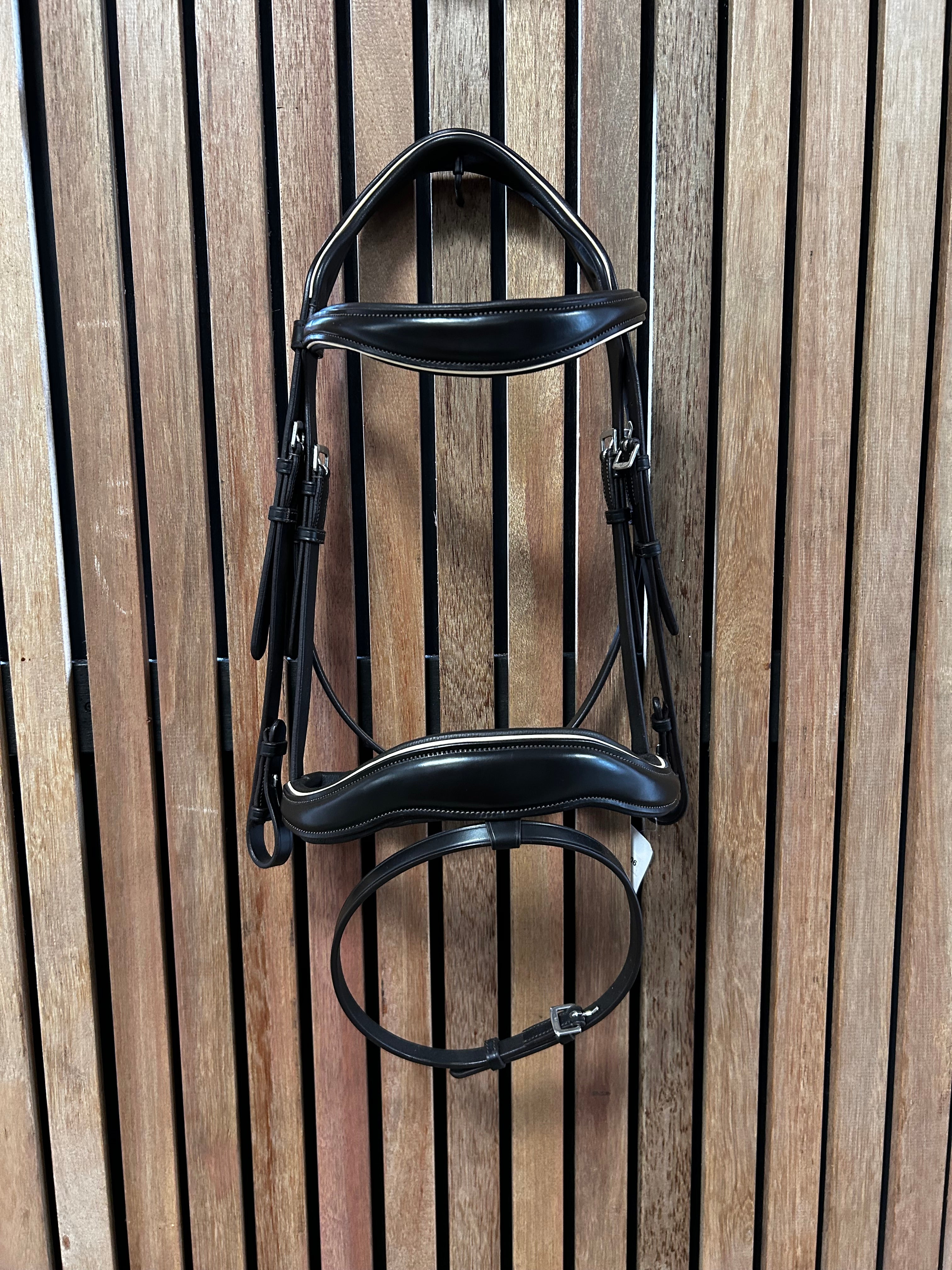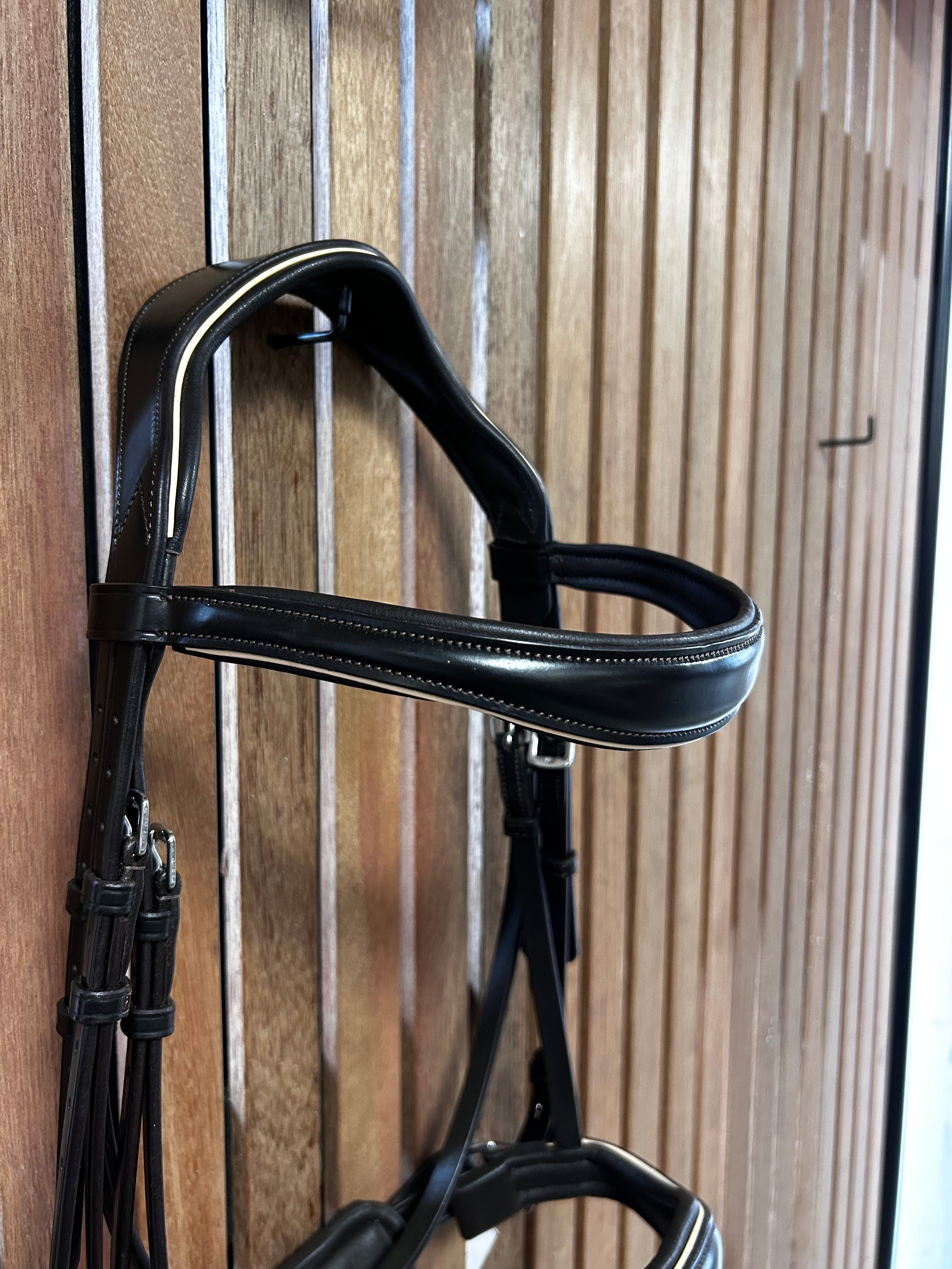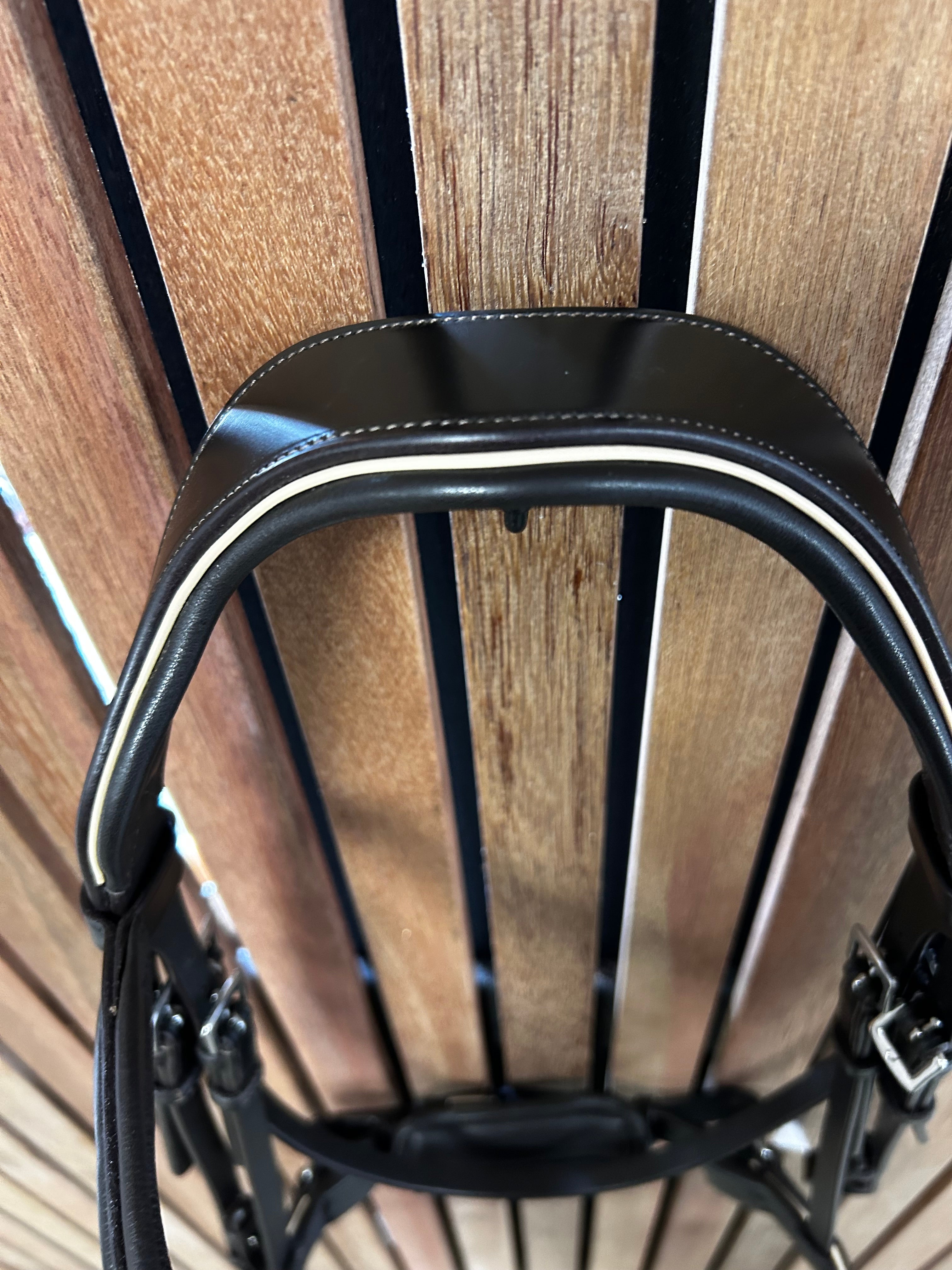 Prachtig donkerbruin hoofdstel met creme/witte piping.