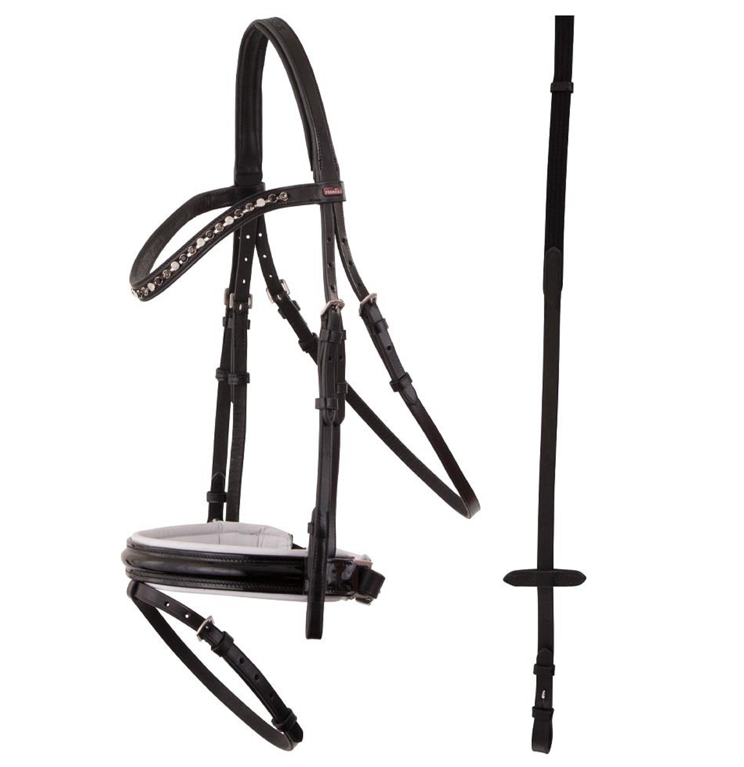 Symmetrisch hoofdstel met een anatomisch gevormd, zacht gevoerd kopstuk dat aan beide zijden is teruggesneden voor extra vrijheid. Het licht gebogen frondeel is ingelegd met XL imitatie diamanten in drie kleuren (Basalt/Black/Opal) en is onderlegd met zacht leder. De brede (circa 4 cm) gecombineerde aansnoerneusriem met lakleder is rond gebombeerd, zacht gevoerd en is voorzien van een zacht gevoerde kaakbeschermer. De bakstukken zijn voorzien van blinde sluitingen. Het hoofdstel is voorzien van roestvrijstalen fournituren. De bijgeleverde linnen teugel heeft hand- en teugelstops en blinde sluitingen.