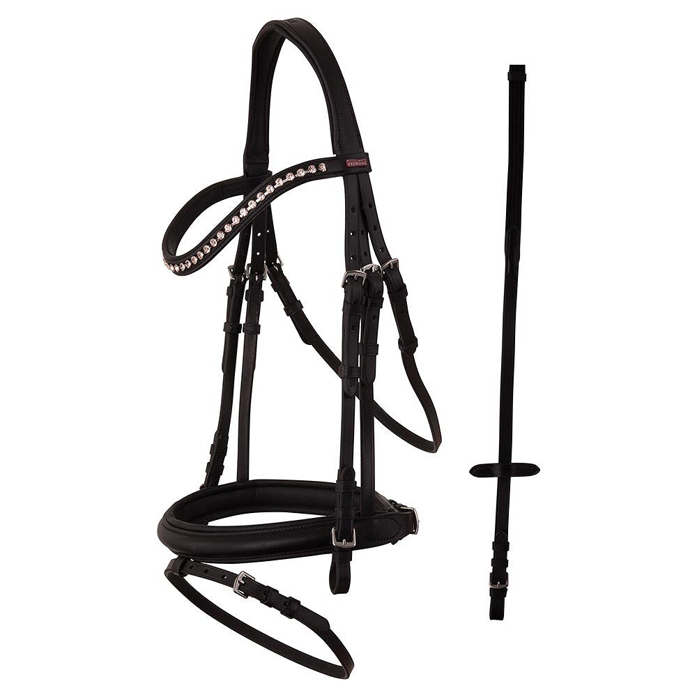 Symmetrisch hoofdstel met een anatomisch gevormd, zacht gevoerd kopstuk dat teruggesneden is bij de oren voor extra vrijheid. Het licht gebogen frondeel is ingelegd met "Red Onion" XL imitatie diamanten en is onderlegd met zacht leder. De gecombineerde neusriem (circa 3 cm) is rond gebombeerd en zacht gevoerd. Het hoofdstel is voorzien van roestvrijstalen fournituren. De bijgeleverde linnen teugel heeft hand- en teugelstops.