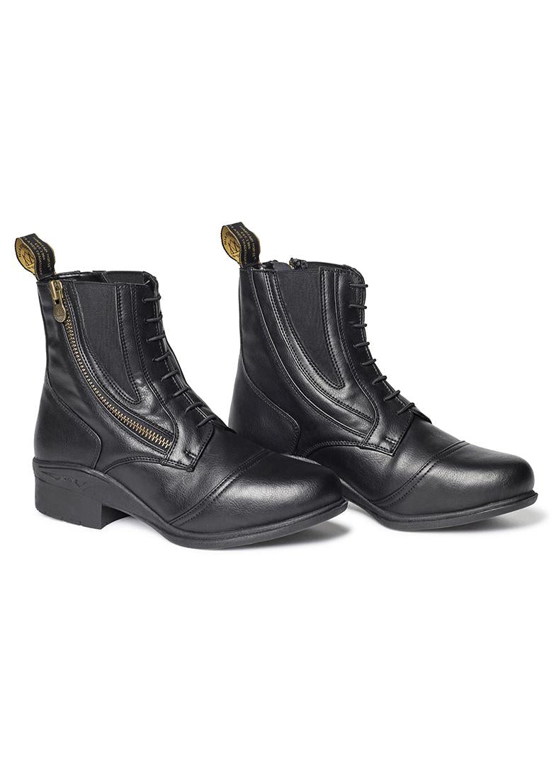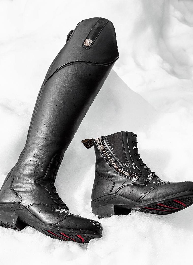 De ritsluiting van de schoenen bevindt zich aan de buitenkant van de voet om het risico op schuren tegen paard en uitrusting te verminderen en om ze gemakkelijker aan en uit te trekken.