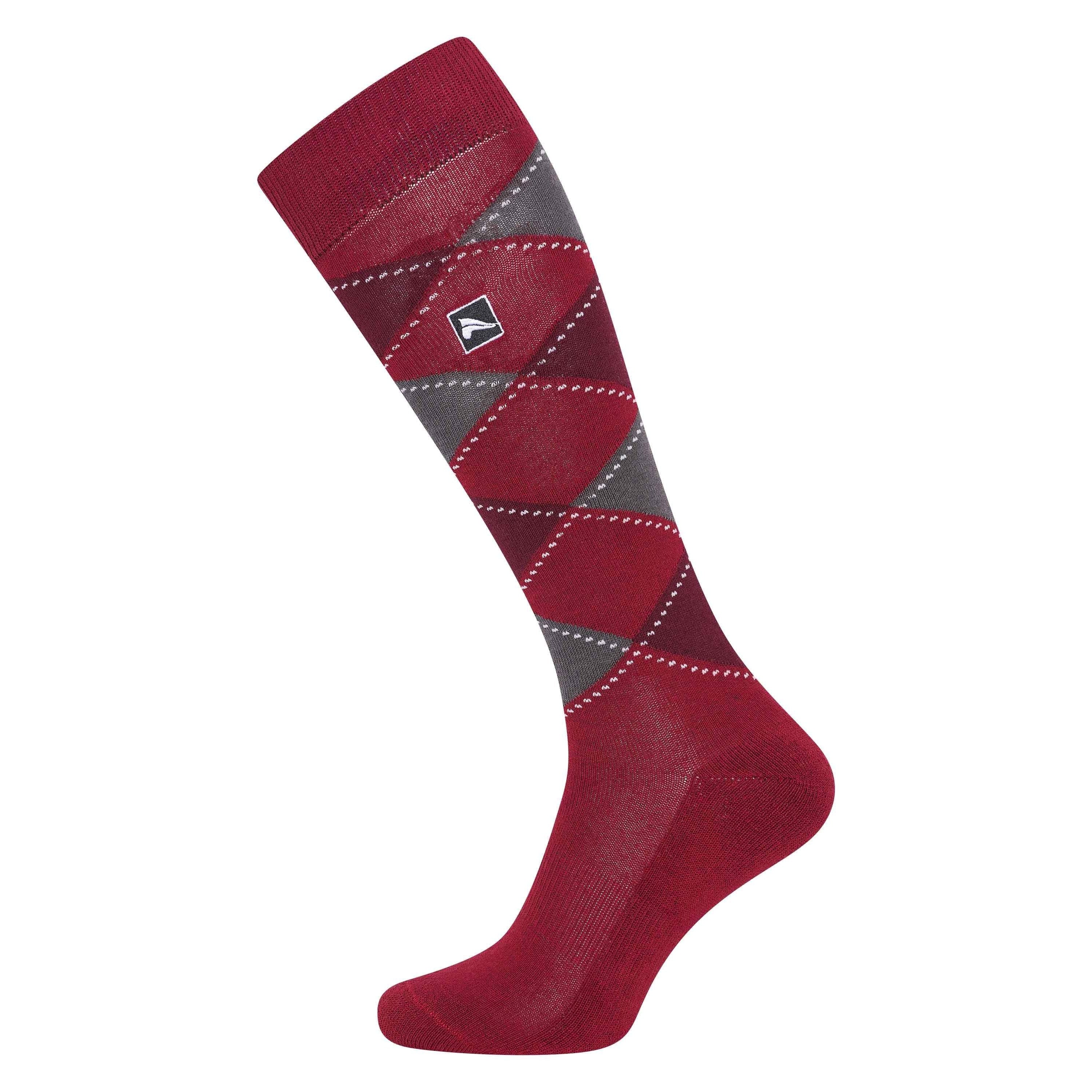 Deze hoogwaardige sokken met een tijdloos ruitpatroon zijn speciaal ontworpen voor ruiters. De rijsokken hebben een zachte zool voor extra comfort en de hiel en tenen zijn versterkt. De POLYGIENE-behandeling van het materiaal, bestaande uit 77% katoen, 21% polyester en 2% elasthan, voorkomt zweetgeur.