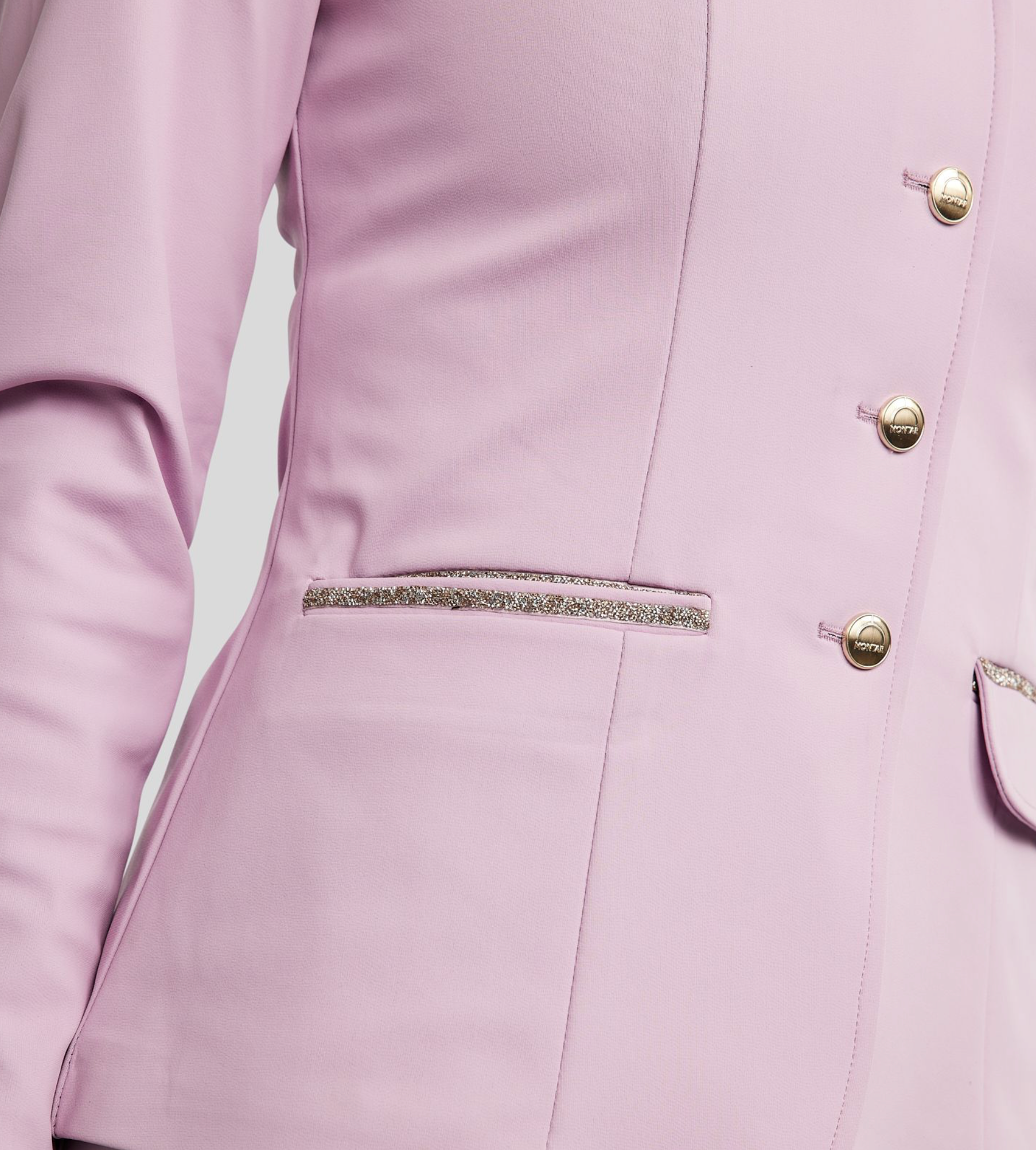 Prachtige champagnekleurige crystal tape details geven het jasje een luxe en stijlvolle uitstraling. De tape is subtiel geplaatst boven en onder de zakken, waardoor de kleppen in de zakken gestopt kunnen worden voor een strakke en gestroomlijnde look. Op de schouder zorgt een verfijnd Montar-logo in kleine champagnekleurige kristallen voor een exclusieve afwerking met een subtiele sparkle.