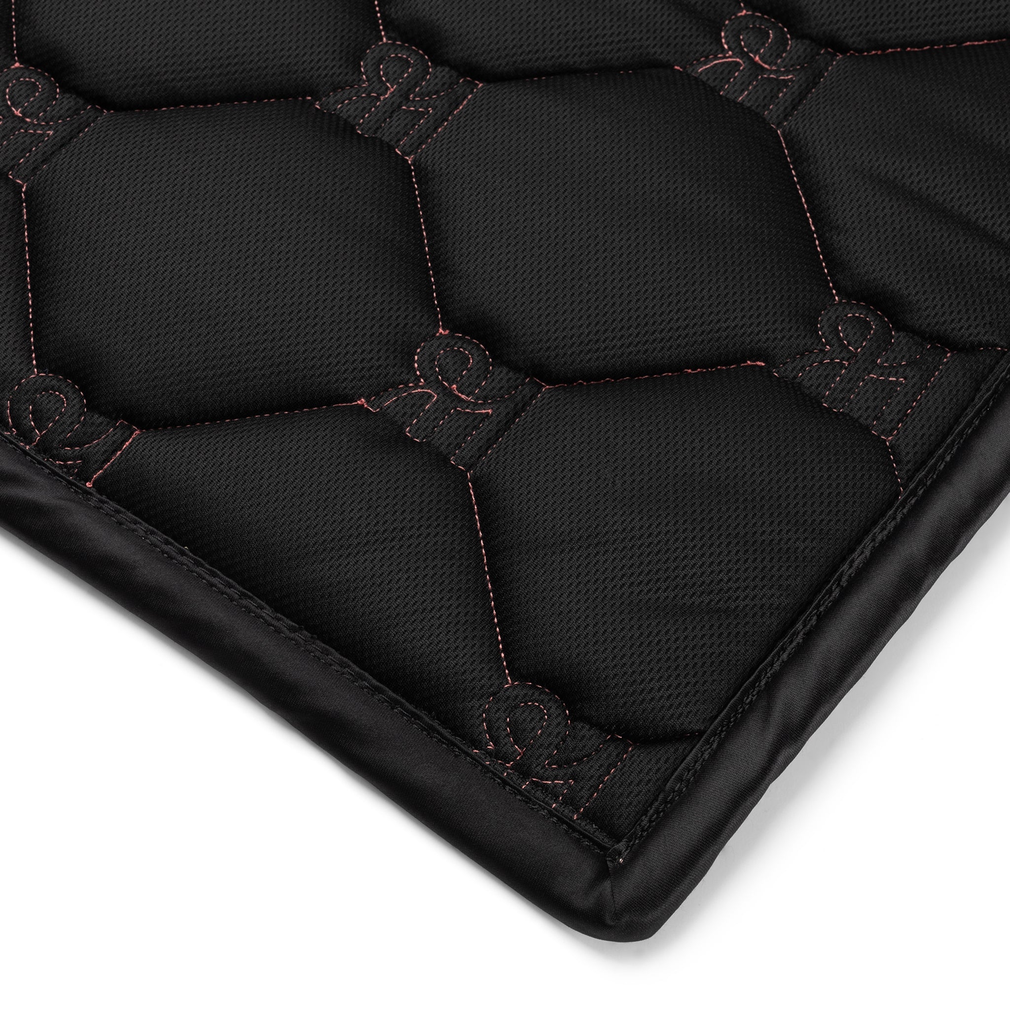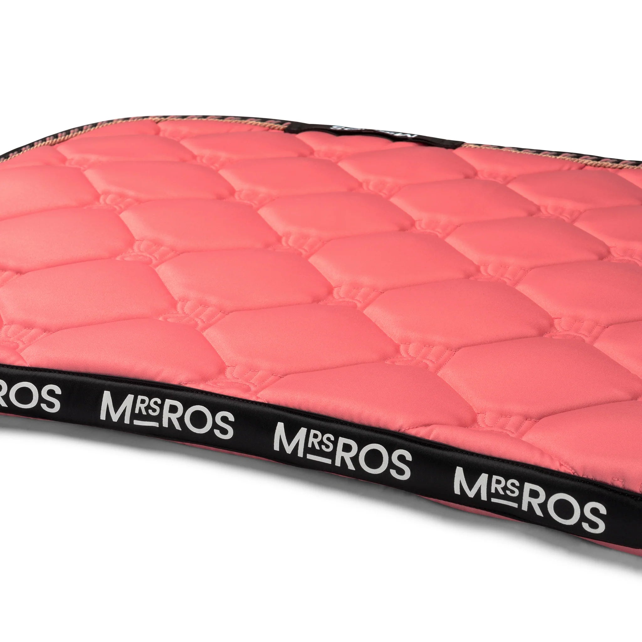 Het Charmer dressuur zadeldekje heeft een diamant patroon met het Mrs. Ros logo geborduurd in elke diamant. Het dekje heeft 2 gedraaide koorden en een satijnen rand. Het logo is uitgesneden in goud.