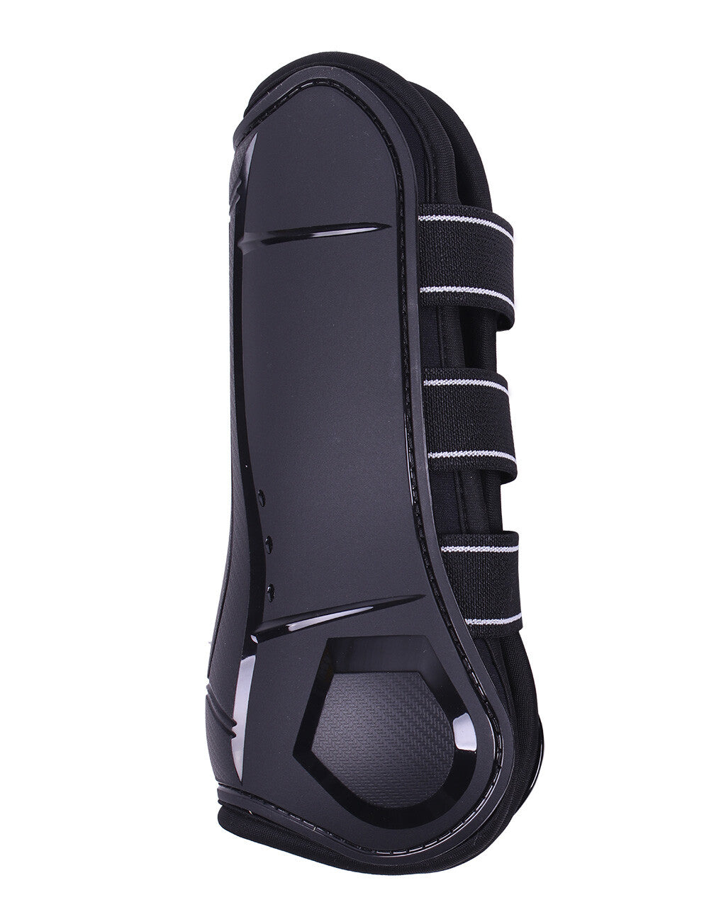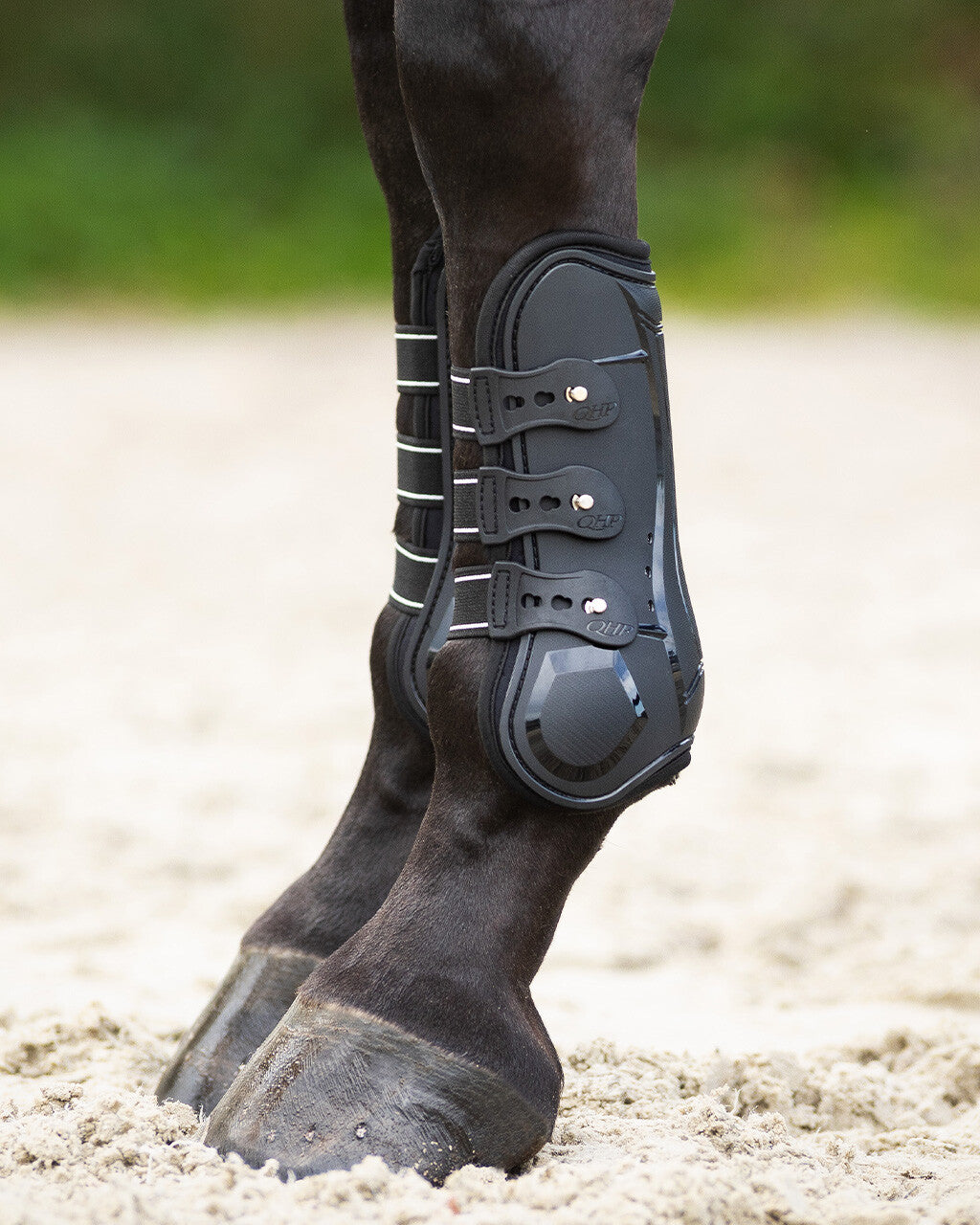 Sportieve peesbeschermer van QHP. Deze peesbeschermers hebben een speciale airflow neopreen voering waardoor warmte en vocht goed worden afgevoerd. Dankzij de luchtgaatjes in de schaal worden de pezen niet te warm. De elastische snelsluitingen maken deze peesbeschermers makkelijk te bevestigen. Deze peesbeschermers hebben een anatomisch gevormde schaal voor een goede pasvorm. De glanzende strepen en patronen op de matte schaal geven de beschermers een sportieve uitstraling.