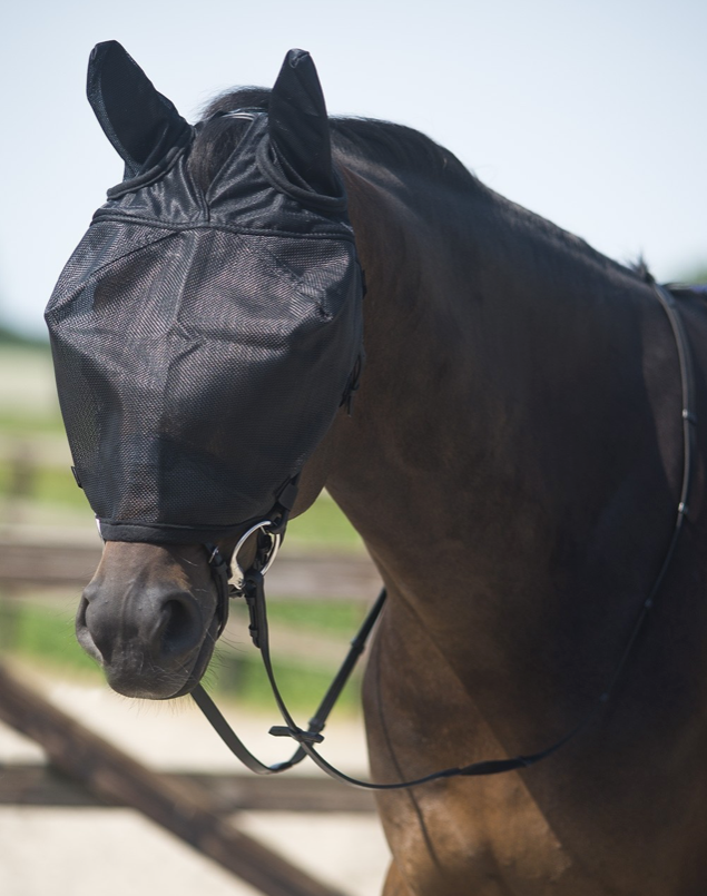 Vliegenmasker die makkelijk te bevestigen is aan het kopstuk, de bakstukken en de neusriem van een hoofdstel. Daarom is het masker gemakkelijk te gebruiken tijdens het rijden. Het masker is gemaakt van stevige mesh en rondom de oren van een fijne, soepele mesh.