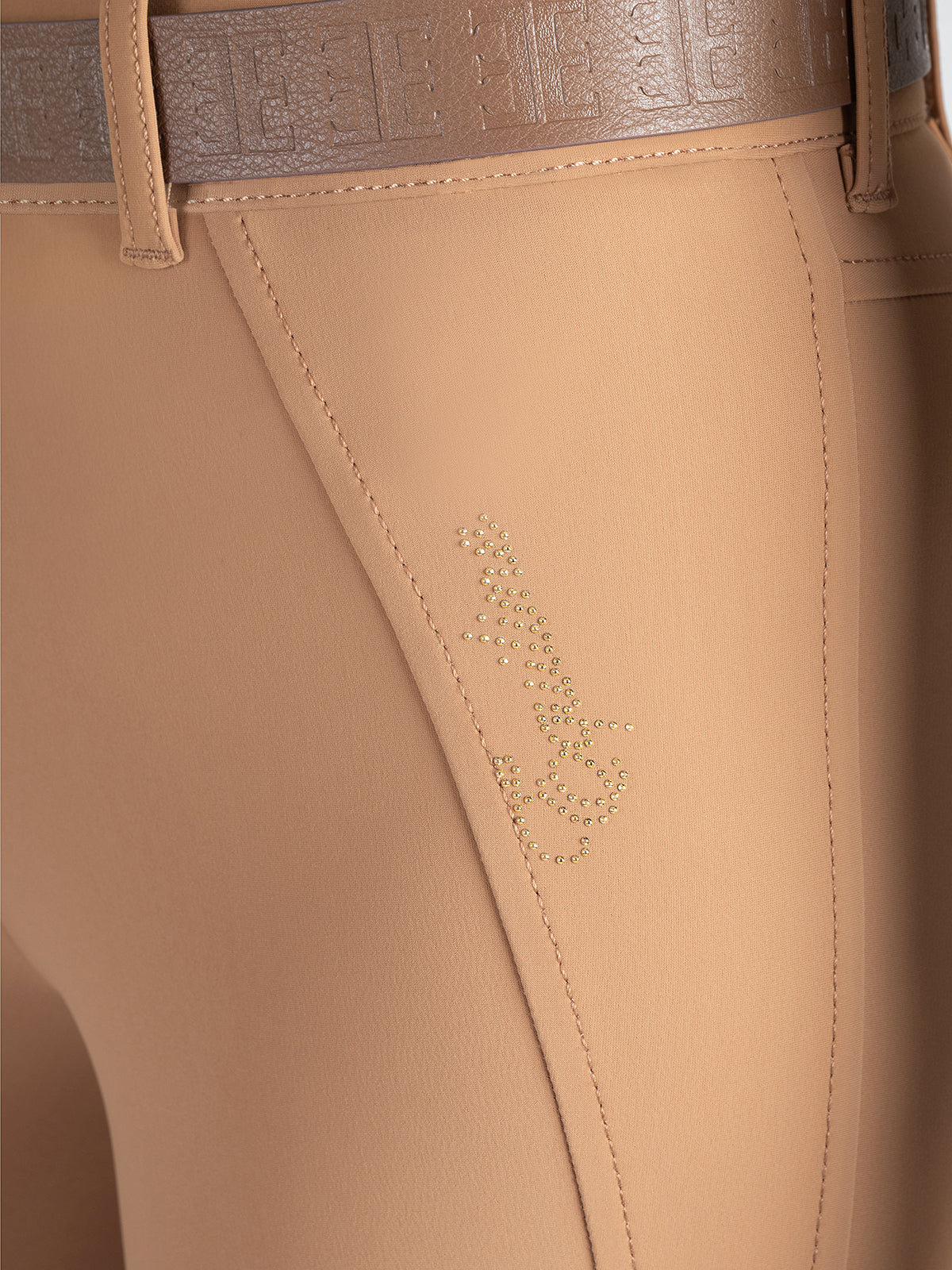 Dames rijbroek met kniegrip gemaakt van B-MOVE all seasons gebonden stof (340gr). Ademend, zacht en zeer rekbaar, ze zijn gemaakt om langdurig comfort te bieden tijdens uitdagende trainingssessies. Kenmerkend: stretch bevestigingssysteem op de onderbenen, kniegripsysteem en hoge taille voor een perfecte pasvorm. Equiline-logo in lichtgouden microstuds en UPF 50+ zonbescherming.