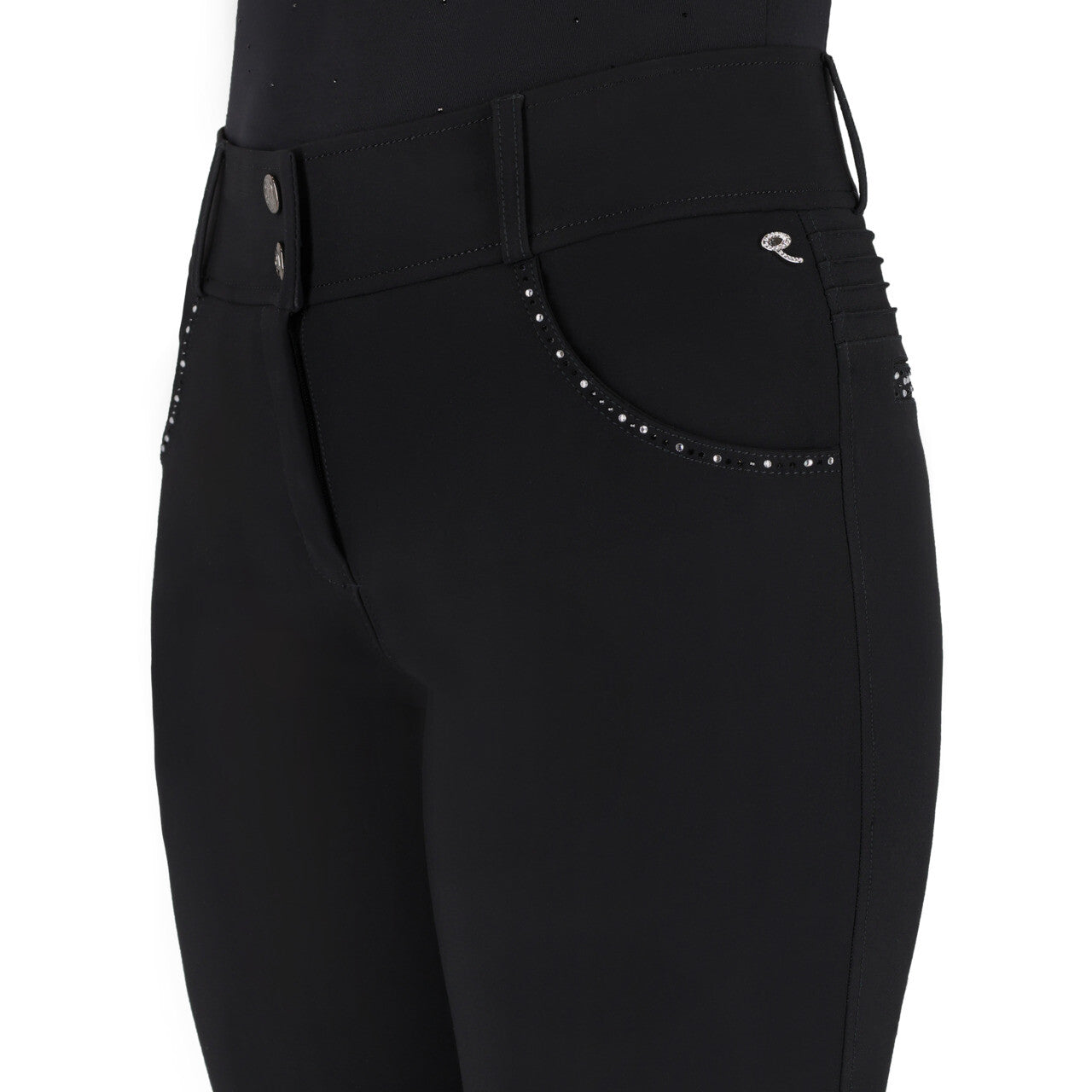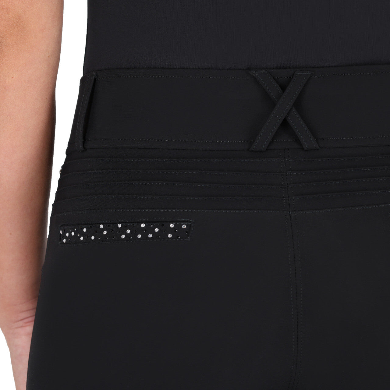 Rijbroek Oakleigh combineert comfort met stijlvolle details. De hoge taille zorgt voor een fijne pasvorm en de beengrip biedt extra steun tijdens het rijden. De broek heeft twee steekzakken met strass-steentjes, en ook aan de achterkant zorgen twee sierzakjes met strass voor een chique touch. De geribbelde afwerking op de achterzijde geeft de broek net dat beetje extra luxe.